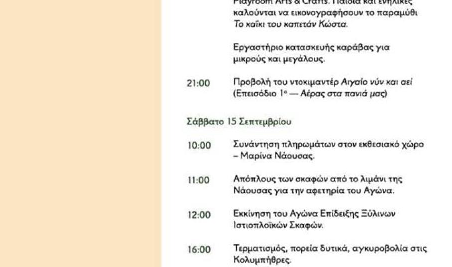Στην επιτυχία της περυσινής διοργάνωσης συνέβαλαν η καλοκαιρία, ο εθελοντισμός, η προσφορά, η γεμάτη ξύλινα σκάφη θάλασσα, η μαγευτική ατμόσφαιρα που δημιουργήθηκε στο παραδοσιακό λιμανάκι της Νάουσας και έφερε ρίγη και δάκρυα συγκίνησης σε μάτια που “θυμήθηκαν” και μη.