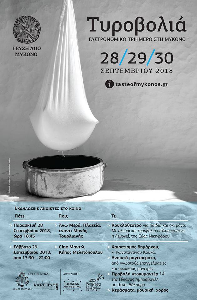 Η Λέσχη σε συνεργασία με τον Δήμο Μυκόνου και την ΚΔΕΠΠΑΜ διοργανώνουν από 28 έως 30 Σεπτεμβρίου ένα τριήμερο αφιέρωμα για την ανάδειξη της Τυροβολιάς, ενός από τα πιο σημαντικά και εμβληματικά τυριά του νησιού.