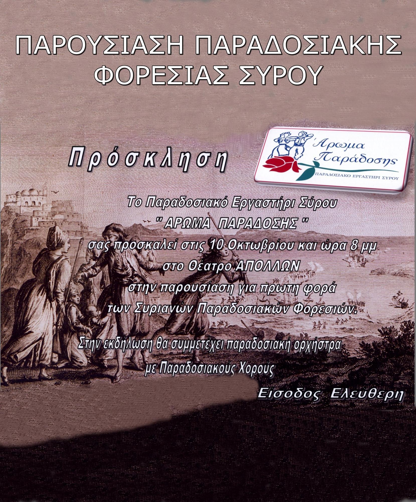 Το Παραδοσιακό Εργαστήρι Σύρου «Άρωμα Παράδοσης» σας προσκαλεί την Τετάρτη 10 Οκτωβρίου 2018 και ώρα 20:00, στο Θέατρο Απόλλων, στην παρουσίαση της Γυναικείας & της Ανδρικής Παραδοσιακής Φορεσιάς της Σύρου.