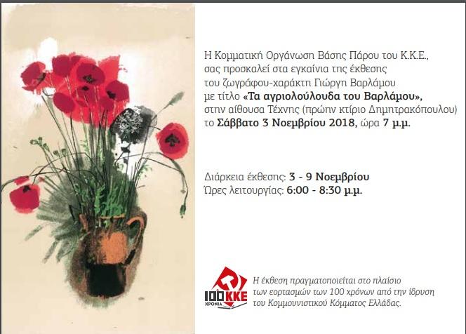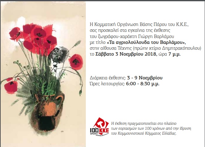 Η Κοµµατική Οργάνωση Βάσης Πάρου του Κ.Κ.Ε., σας προσκαλεί στα εγκαίνια της έκθεσης του ζωγράφου-χαράκτη Γιώργη Βαρλάµου µε τίτλο «Τα αγριολούλουδα του Βαρλάµου», στην αίθουσα Τέχνης (πρώην κτίριο ∆ηµητρακόπουλου) το Σάββατο 3 Νοεµβρίου 2018, ώρα 7 µ.µ.