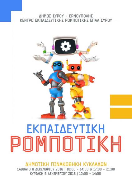 Στο πλαίσιο του Χριστουγεννιάτικου Πολιτιστικού Προγράμματος, σας προσκαλούμε στην εκδήλωση του Δήμου Σύρου – Ερμούπολης και του Κέντρου Ρομποτικής ΕΠΑΛ Σύρου, στην Πινακοθήκη Κυκλάδων, το Σάββατο 8 και Κυριακή 9 Δεκεμβρίου 2018.