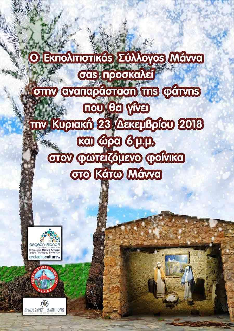 Ο Εκπολιτιστικός Σύλλογος Μάννα σας προσκαλεί στην αναπαράσταση της φάτνης που θα πραγματοποιηθεί την Κυριακή 23 Δεκεμβρίου 2018 και ώρα 18:00 στον φωτειζόμενο φοίνικα στο Κάτω Μάννα, στο πλαίσιο του χριστουγεννιάτικου πολιτιστικού προγράμματος του Δήμου Σύρου - Ερμούπολης.
