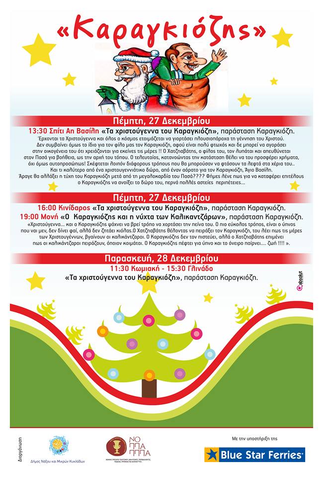 Το Νομικό Πρόσωπο Πολιτισμού Αθλητισμού Περιβάλλοντος Παιδείας Πρόνοιας και Αλληλεγγύης του Δήμου Νάξου και Μικρών Κυκλάδων ενημερώνει ότι η παράσταση "Τα χριστούγεννα του Καραγκιόζη" στη Χώρα της Νάξου αντί αύριο το απόγευμα στις 19:00 θα πραγματοποιηθεί σήμερα το μεσημέρι στις 14:00.