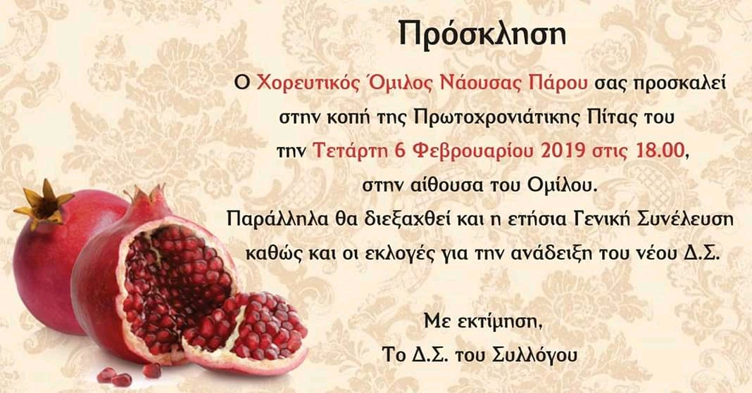 Ο Χορευτικός Όμιλος Νάουσας Πάρου υποδέχεται το νέο έτος με μία λιτή γιορτή την Τετάρτη 6 Φεβρουαρίου.