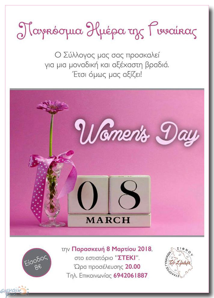 Χοροεσπερίδα κι εκδήλωση από τον Σύλλογο Γυναικών Σίφνου για την Παγκόσμια Ημέρα της Γυναίκας.