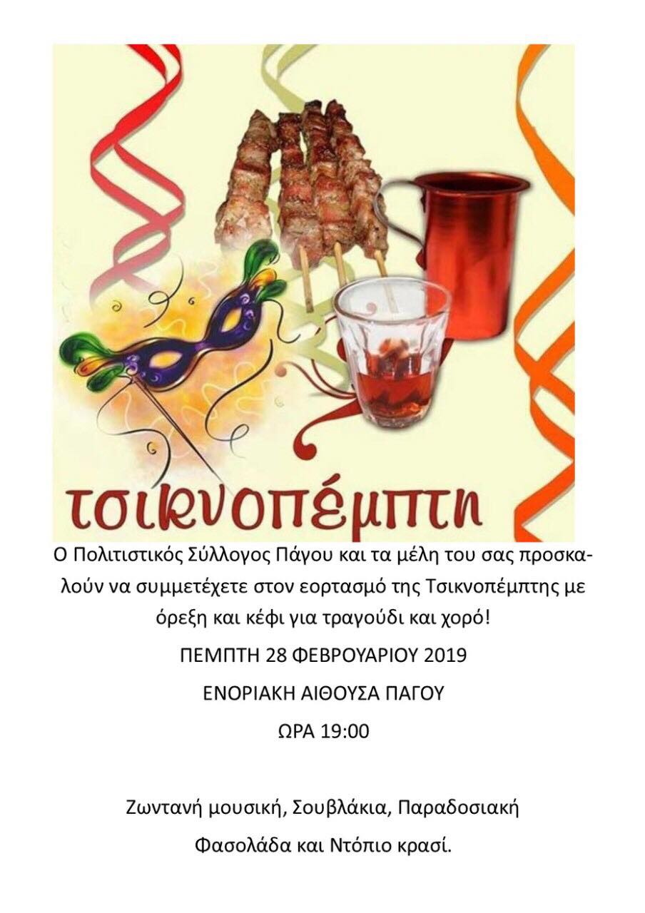 Ο Πολιτιστικός Σύλλογος Πάγου και τα μέλη του σας προσκαλούν να συμμετέχετε στον εορτασμό της Τσικνοπέμπτης με όρεξη και κέφι για τραγούδι και χορό!