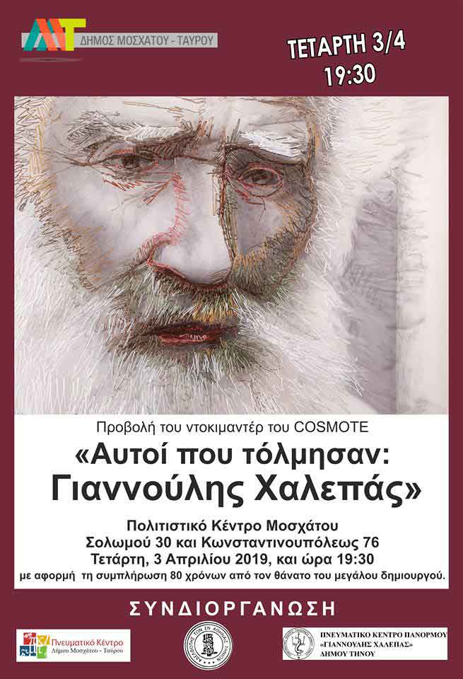 Το Εργαστήριο Ζωγραφικής του Πνευματικού Κέντρου του Δήμου Μοσχάτου- Ταύρου, σε συνεργασία με το Πνευματικό Κέντρο Πανόρμου Τήνου και την Αδελφότητα των εν Αθήναις Τηνίων σας προσκαλούν στην προβολή του ντοκιμαντέρ της COSMOTE TV (History) «Αυτοί που τόλμησαν: Γιαννούλης Χαλεπάς» στο Πολιτιστικό Κέντρο «Θ. Αγγελόπουλος», στο Μοσχάτο (Κωνσταντινουπόλεως και Σολωμού), την Τετάρτη, 3 Απριλίου 2019, και ώρα 19.30, με αφορμή τη συμπλήρωση 80 χρόνων από τον θάνατο του μεγάλου δημιουργού.