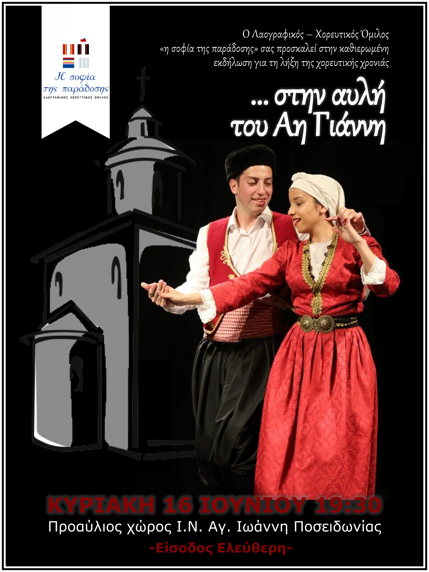 Ο Λαογραφικός - Χορευτικός Όμιλος "η σοφία της παράδοσης" σας προσκαλεί στην καθιερωμένη εκδήλωση για τη λήξη της χορευτικής χρονιάς "Στην Αυλή του Αη Γιάννη", που θα πραγματοποιηθεί την Κυριακή 16 Ιουνίου 2019 και ώρα 19:30, στον προαύλιο χώρο του Ιερού Ναού Αγίου Ιωάννη Ποσειδωνίας.