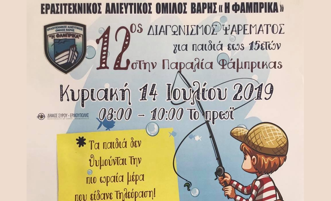 Στο πλαίσιο του πολιτιστικού προγράμματος του Δήμου Σύρου – Ερμούπολης «Σύρος Πολιτισμός 2019», ο Αλιευτικός Όμιλος Βάρης «Η Φάμπρικα» και ο Πολιτιστικός Σύλλογος Βάρης «Η Πανάχραντος» διοργανώνουν τον Διαγωνισμό Ψαρέματος στο Λιμανάκι Φάμπρικας, την Κυριακή 14 Ιουλίου 2019 και ώρα 10:00.