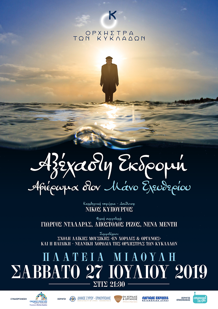 Η Ορχήστρα των Κυκλάδων σε συνδιοργάνωση με την Περιφέρεια Νοτίου Αιγαίου, τιμά τον μεγάλο συριανό στιχουργό, ποιητή και πεζογράφο Μάνο Ελευθερίουκαι παρουσιάζει μια συναυλία-αφιέρωμα στο έργο του, το Σάββατο 27/7/19 στην Πλατεία Μιαούλη.