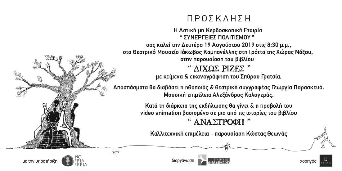 Η αστική μη κερδοσκοπική εταιρεία “Συνέργειες Πολιτισμού” παρουσιάζει τη Δευτέρα 19 Αυγούστου στο Θεατρικό Μουσείο Ιάκωβος Καμπανέλλης και ώρα 8:30 μ.μ. στη Γρόττα της Χώρας Νάξου, το βιβλίο με τίτλο “Δίχως Ρίζες” με κείμενα και εικονογράφηση του Σπύρου Γρατσία. Αποσπάσματα του βιβλίου θα διαβάσει η ηθοποιός & θεατρική συγγραφέας Γεωργία Παρασκευά και η μουσική επιμέλεια είναι του Αλέξανδρου Καλογερά. Η επιμέλεια παρουσίασης είναι του Κώστα Θεωνά.