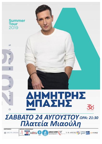 Στο πλαίσιο του πολιτιστικού προγράμματος του Δήμου Σύρου – Ερμούπολης «Σύρος Πολιτισμός 2019», ο Δήμος Σύρου – Ερμούπολης διοργανώνει συναυλία με τον Δημήτρη Μπάση, το Σάββατο 24 Αυγούστου 2019 και ώρα 21:00, στην Πλατεία Μιαούλη.