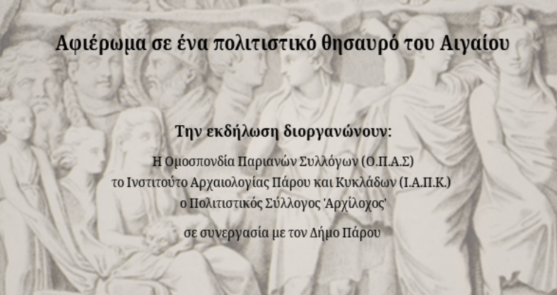 Η Ομοσπονδία Παριανών Συλλόγων (Ο.Π.Α.Σ), το Ινστιτούτο Αρχαιολογίας Πάρου και Κυκλάδων (Ι.Α.Π.Κ.) και ο Πολιτιστικός Σύλλογος "Αρχίλοχος" σε συνεργασία με τον Δήμο Πάρου διοργανώνουν εκδήλωση το Σάββατο 30 Νοεμβρίου 2019 και ώρα 10 π.μ. στην Παλιά Βουλή (Σταδίου 13, Αθήνα) με θέμα: «Τα Αρχαία Λατομεία Μαρμάρου της Πάρου: Η Σημασία και η Ανάδειξη του Μνημείου και του Χώρου του»