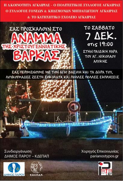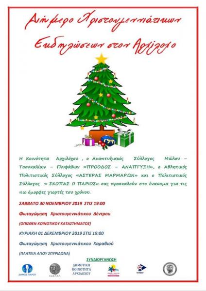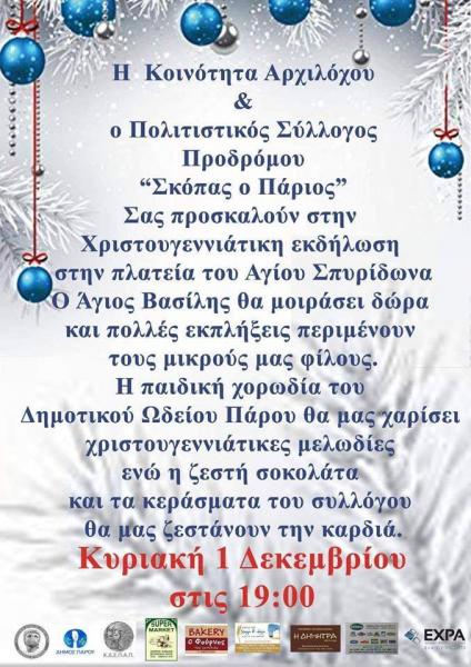 Στο πλαίσιο των Χριστουγεννιάτικων εκδηλώσεων του Δήμου Πάρου, η Κοινωφελής Δημοτική Επιχείρηση Πολιτιστικής Ανάπτυξης Πάρου (ΚΔΕΠΑΠ) ανακοινώνει, πως θα πραγματοποιηθούν οι εξής εκδλώσεις από αύριο, Σάββατο 30 Νοεμβρίου, έως και τις 11 Δεκεμβρίου 2019.