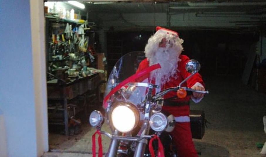 Λόγω έλλειψης χιονιού, ο Άγιος Βασίλης άφησε φέτος τους ταράνδους και το έλκηθρο του κάπου μακριά, καβάλησε την μοτοσικλέτα του και συνέχισε το ταξίδι του για να επισκεφθεί τους περίπου 60 μικρούς φίλους του που από νωρίς τον περίμεναν στην ενοριακή αίθουσα του Πάγου στην Σύρο! Μικροί και μεγάλοι που είχαν κατακλείσει την αίθουσα τον υποδέχτηκαν με μεγάλο ενθουσιασμό και εγκαρδιότητα και εκείνος σε ανταπόδοση κάθισε ανάμεσα τους και μοίρασε δωράκια σε όλους τους λιλιπούτειους φίλους και φίλες που τον περιστοίχιζαν με απορία και περιέργεια. Κατόπιν φωτογραφήθηκε μαζί τους και τους παρότρυνε να είναι καλά παιδιά με την υπόσχεση ότι θα επανέλθει την επόμενη χρονιά. Η βραδιά έκλεισε με την προβολή παιδικής χριστουγεννιάτικης ταινίας.