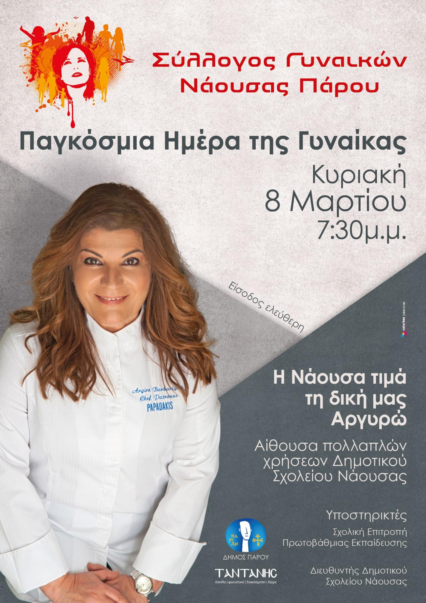 Το Διοικητικό Συμβούλιο και τα μέλη του Συλλόγου Γυναικών Νάουσας Πάρου σας προσκαλούν στην εκδήλωση που διοργανώνουν με αφορμή την παγκόσμια ημέρα για τα δικαιώματα των γυναικών και προς τιμή της δικής μας σέφ και πρέσβειρας της περιφέρειας Ν. Αιγαίου ως Γαστρονομικής Περιφέρειας της Ευρώπης για το 2019, κυρίας Αργυρώς Μπαρμπαρίγου,