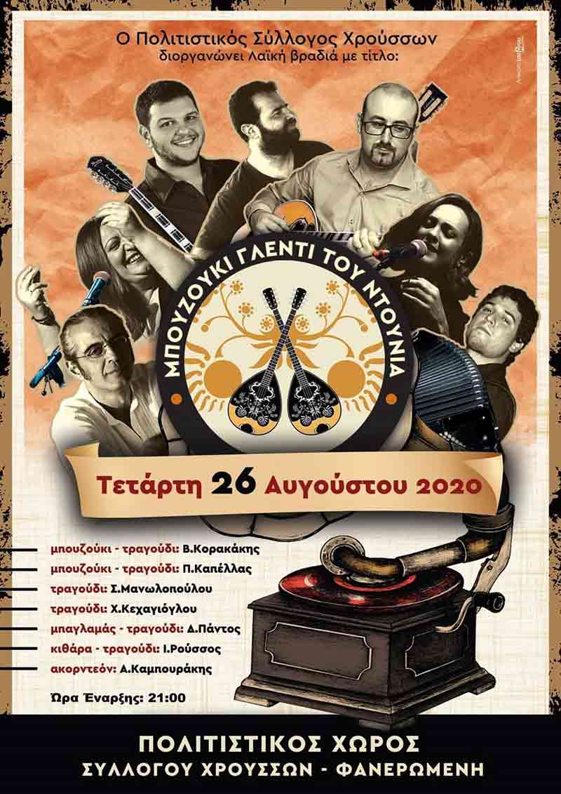 Ο Πολιτιστικός Σύλλογος Χρούσσων διοργανώνει Λαϊκή Βραδιά με τίτλο: “Μπουζούκι, γλέντι του ντουνιά” την Τετάρτη 26 Αυγούστου 2020 στις 21.00 στον πολιτιστικό χώρο του, κάτω από τον Ιερό Ναό Φανερωμένης.