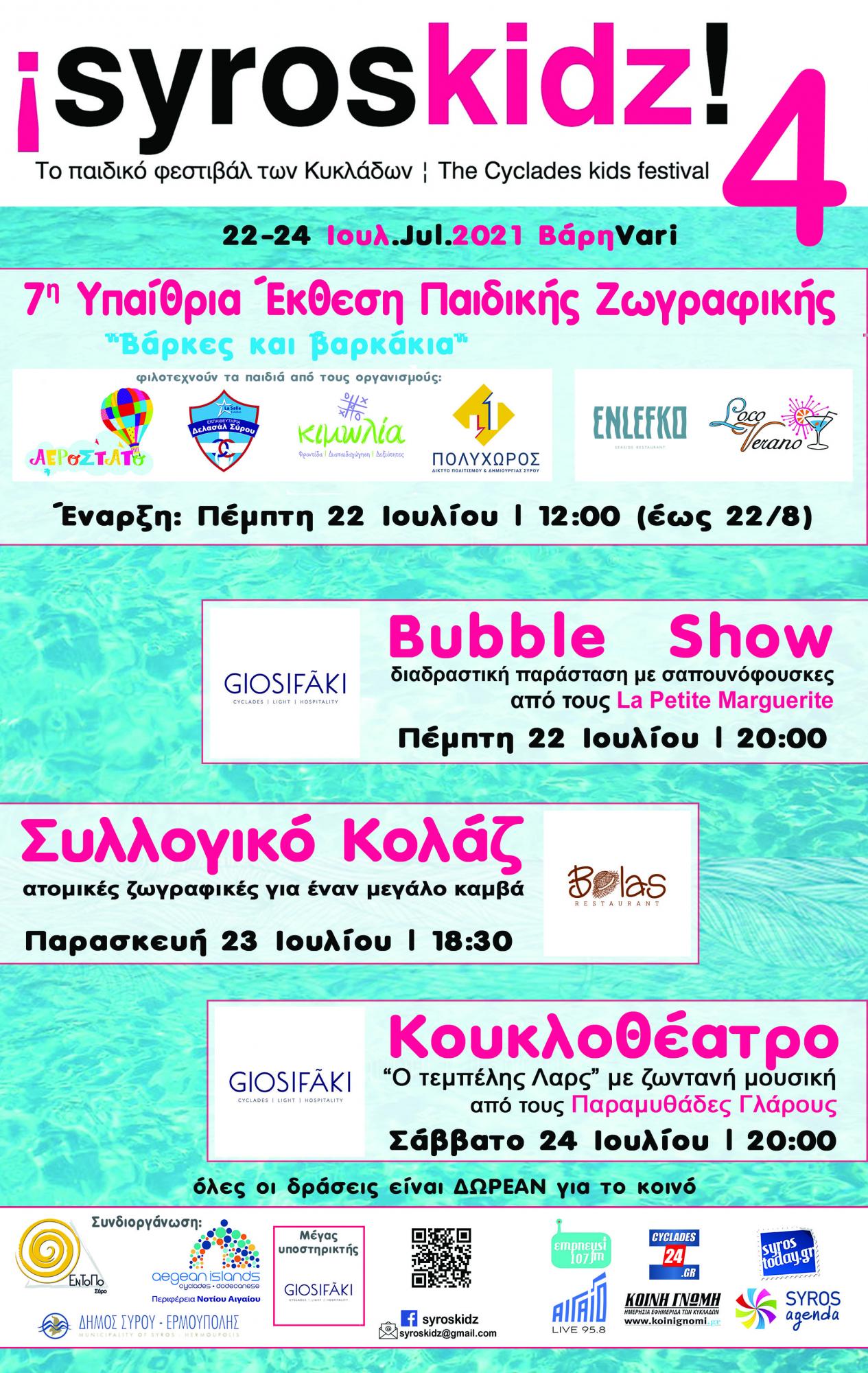 Το ¡syroskidz! επιστρέφει για 4η χρονιά, για να προσφέρει στα παιδιά στιγμές χαράς. Βέβαια, είναι σαφώς μικρότερο από άλλες χρονιές, λόγω των περιοριστικών μέτρων κατά της πανδημίας, όμως οι επιλεγμένες δράσεις είναι ξεχωριστές. Ευχόμαστε σύντομα να μπορέσουμε να το ξαναταξιδέψουμε στις Κυκλάδες.