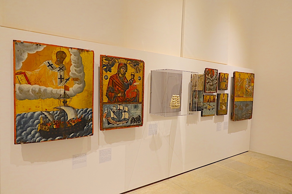Το ταραχώδες Αιγαίο, πριν και κατά την διάρκεια της επανάστασης, εμπνέει μια διακριτή ενότητα της έκθεσης όπου η εμπορική δραστηριότητα και η ναυσιπλοΐα συμπορεύονται με τη δράση των πειρατών και των κουρσάρων για να αναδυθεί στη συνέχεια η ίδια η επαναστατική ναυτική δύναμη. Κυρίαρχη εδώ η αναφορά στην ηρωίδα  Μαντώ Μαυρογένους, την Bella Greca, που αποτελεί την προσωποποίηση της ανιδιοτελούς προσφοράς στον απελευθερωτικό αγώνα με την διάθεση του συνόλου της μεγάλης οικογενειακής της περιουσίας και την προσωπική της συμμετοχής σε πολεμικά επεισόδια του αγώνα.