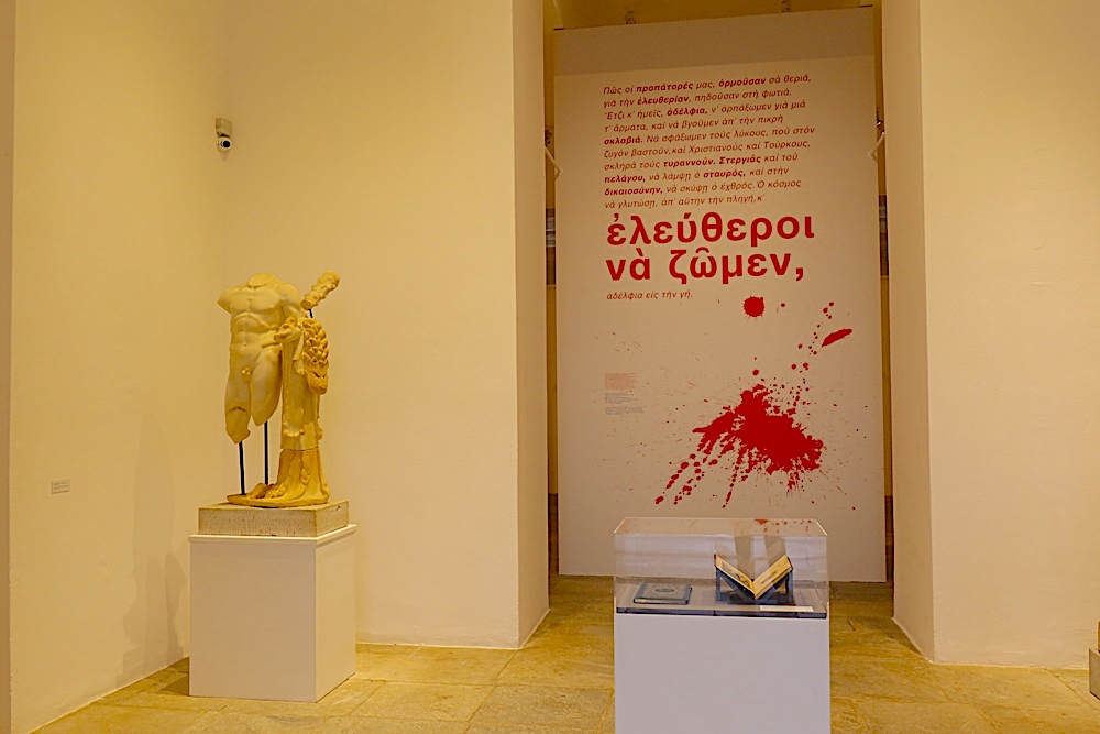 Σχετικά με την έκθεση, ο Σεβασμιώτατος τόνισε, ότι «αποτελεί πράγματι μία μαρτυρία για το πώς το ελληνικό Αιγαίο Πέλαγος, το οποίο την εποχή εκείνη εφλέγετο, διότι εφλέγοντο οι καρδιές των ανθρώπων, των νησιωτών μας, με πρώτη τη Μυκονιάτισσα Μαντώ Μαυρογένους, συνεισέφερε και συνέβαλε στον εθνικό αγώνα, ώστε σήμερα εμείς οι νεοέλληνες, να γιορτάζουμε τα 200 χρόνια ελευθερίας μας. Ταυτόχρονα όμως, θα πρέπει να είναι για μας και ένας προβληματισμός, αν είμεθα πράγματι αντάξιοι της θυσίας αυτών των αγίων πατέρων και προγόνων μας. Και αν σήμερα εμείς επάξια μπορούμε να φέρουμε την τιμή της ελευθερίας, του μεγάλου αυτού αγαθού του Θεού, ενώ εκείνοι, για να την παραδώσουν σε εμάς, έδωσαν τη ζωή τους, το αίμα τους, τους ιδρώτες τους, τα δάκρυά τους, των αγώνα και την αγωνία τους».