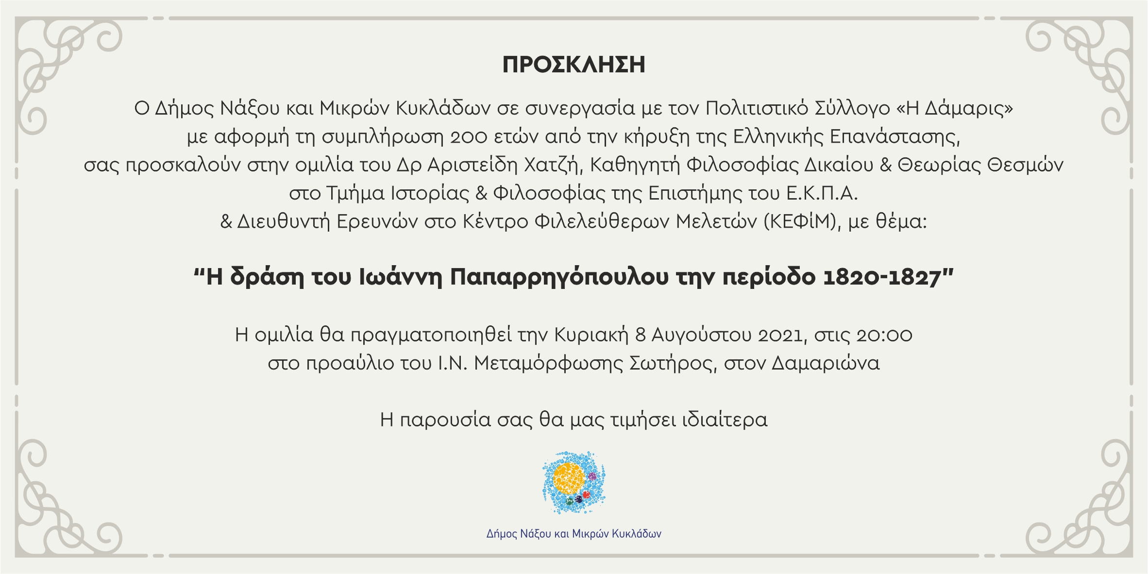 Με αφορμή τη συμπλήρωση 200 ετών από την κήρυξη της Ελληνικής Επανάστασης, σάς προσκαλούμε στην ομιλία για τον Νάξιο Φιλικό Ιωάννη Παπαρρηγόπουλο, που θα πραγματοποιηθεί στον Ι.Ν. Μεταμόρφωσης Σωτήρος, στον Δαμαριώνα, την Κυριακή 8 Αυγούστου 2021, στις 20:00.