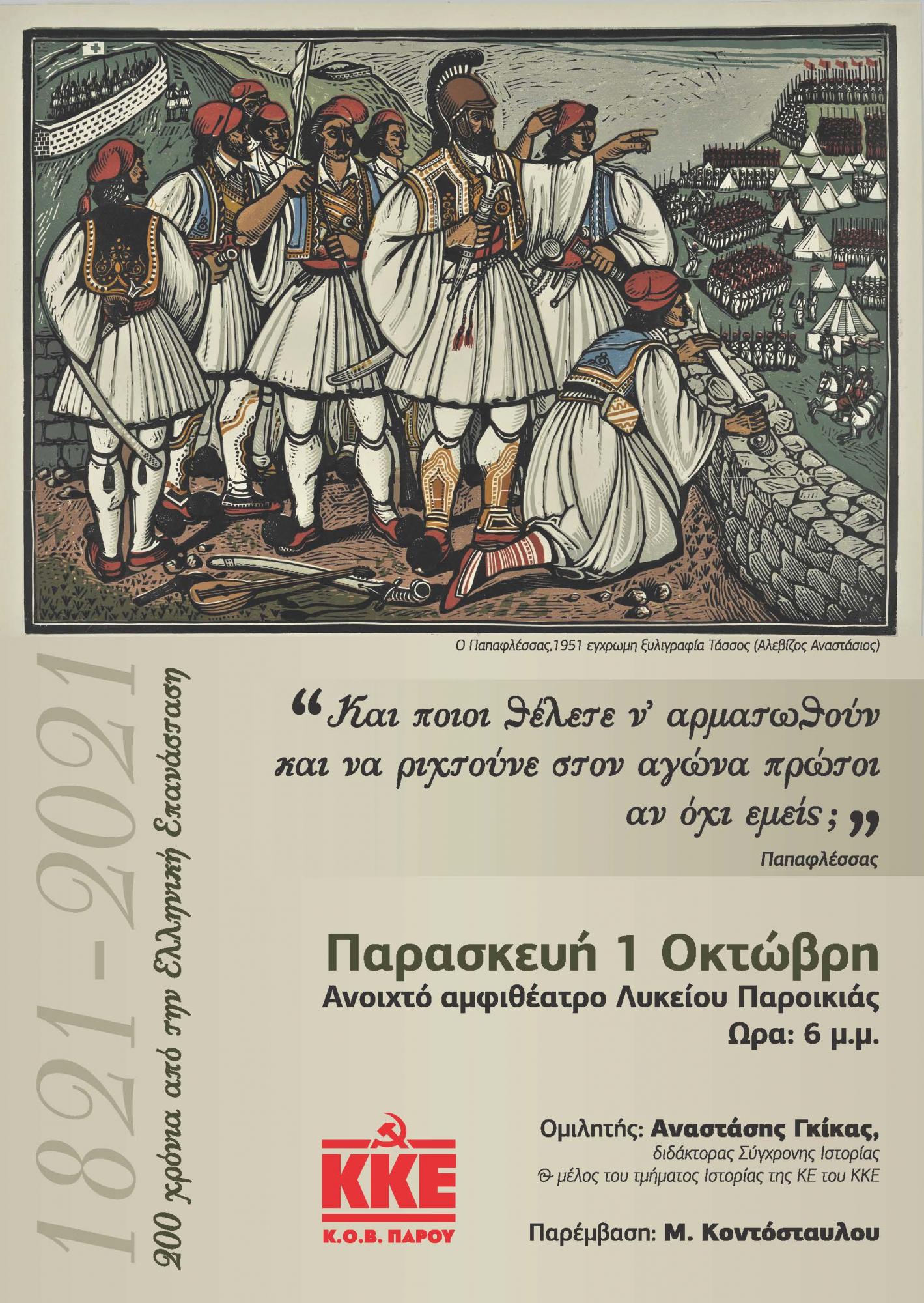 Εκδήλωση διοργανώνει η Κ.Ο. Πάρου του Κ.Κ.Ε. για τα 200 χρόνια απο την Ελληνική Επανάσταση, την Παρασκευή 1 του Οκτώβρη και ώρα 6 μ.μ. στο ανοικτό αμφιθέατρο του Λυκείου της Παροικιάς, με ομιλητή τον Αναστάση Γκίκα διδάκτορα Σύγχρονης Ιστορίας και μέλους του τμήματος Ιστορίας της Κ.Ε. του Κ.Κ.Ε..