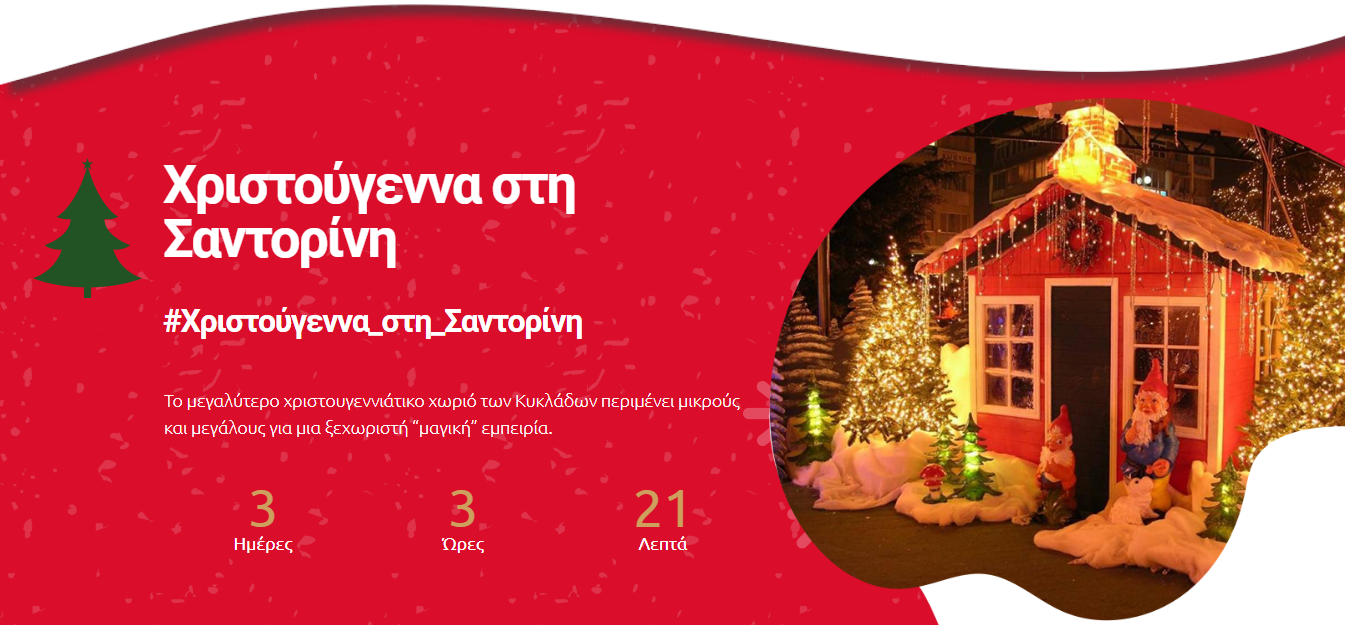 Από τις 3 Δεκεμβρίου 2021 έως τις 3 Ιανουαρίου 2022, τα «Χριστούγεννα στη Σαντορίνη» θα έχουν το δικό τους χώρο στις εγκαταστάσεις του Κλειστού Γυμναστηρίου, όπου μικροί και μεγάλοι θα έχουν τη χαρά να λάβουν μέρος στη μαγεία των Χριστουγέννων.