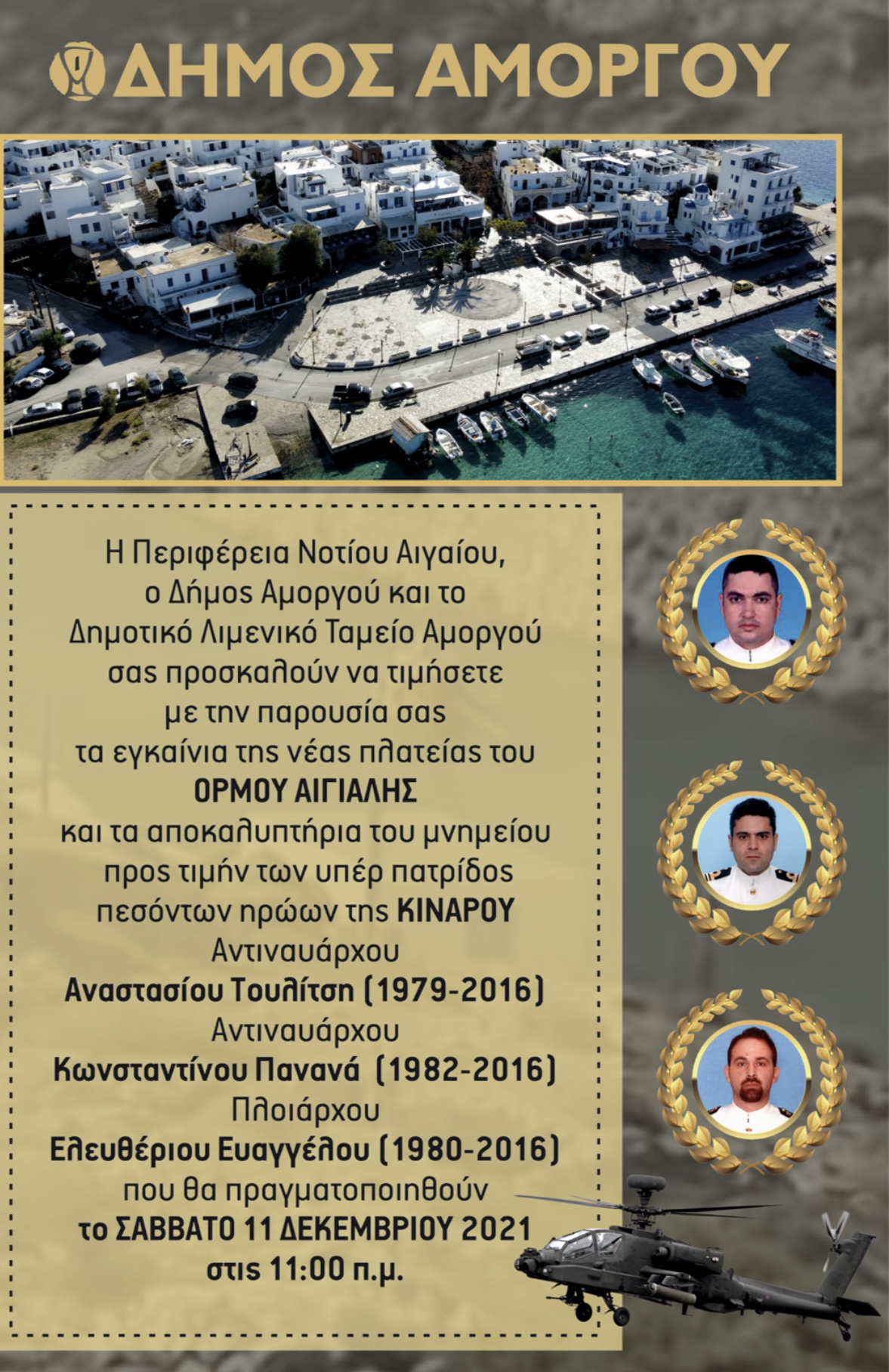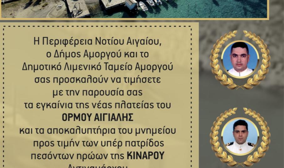 Η νέα πλατεία θα φέρει το όνομα « Πλατεία Ηρώων Κινάρου». Σε μια τελετή μνήμης και σεβασμού θα πραγματοποιηθούν τα αποκαλυπτήρια μαρμάρινου μνημείου που φιλοτέχνησε ο Δήμος Αμοργού τιμώντας έτσι τους ήρωες αξιωματικούς του Πολεμικού Ναυτικού, που κατέπεσαν το ξημέρωμα της 11ης Φεβρουαρίου 2016 στη Νήσο Κίναρος.