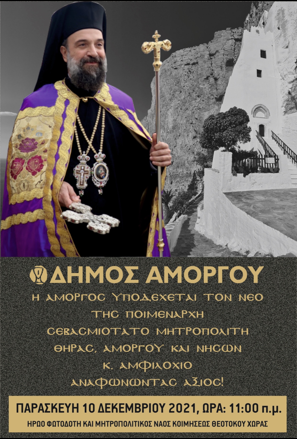 Την Παρασκευή 10 Δεκεμβρίου ο λαός της Αμοργού θα υποδεχτεί το νέο Ποιμενάρχη του, τον Σεβασμιότατο Μητροπολίτη Θήρας, Αμοργό και Νήσων, κ. Αμφιλόχιο. Η λαμπρή τελετή θα πραγματοποιηθεί στις 11:00, στο Ηρώο Φωτοδότη στη Χώρα Αμοργού όπου ο Δήμαρχος Ελευθέριος Καραΐσκος, οι σεβαστοί ιερείς του νησιού, μαθητές και λαός θα υποδεχτούν το Σεβασμιότατο Αμφιλόχιο και στη συνέχεια θα τελεστεί η ενθρόνιση του νέου Ιεράρχη στο Μητροπολιτικό Ναό Κοιμήσεως Θεοτόκου Χώρας.