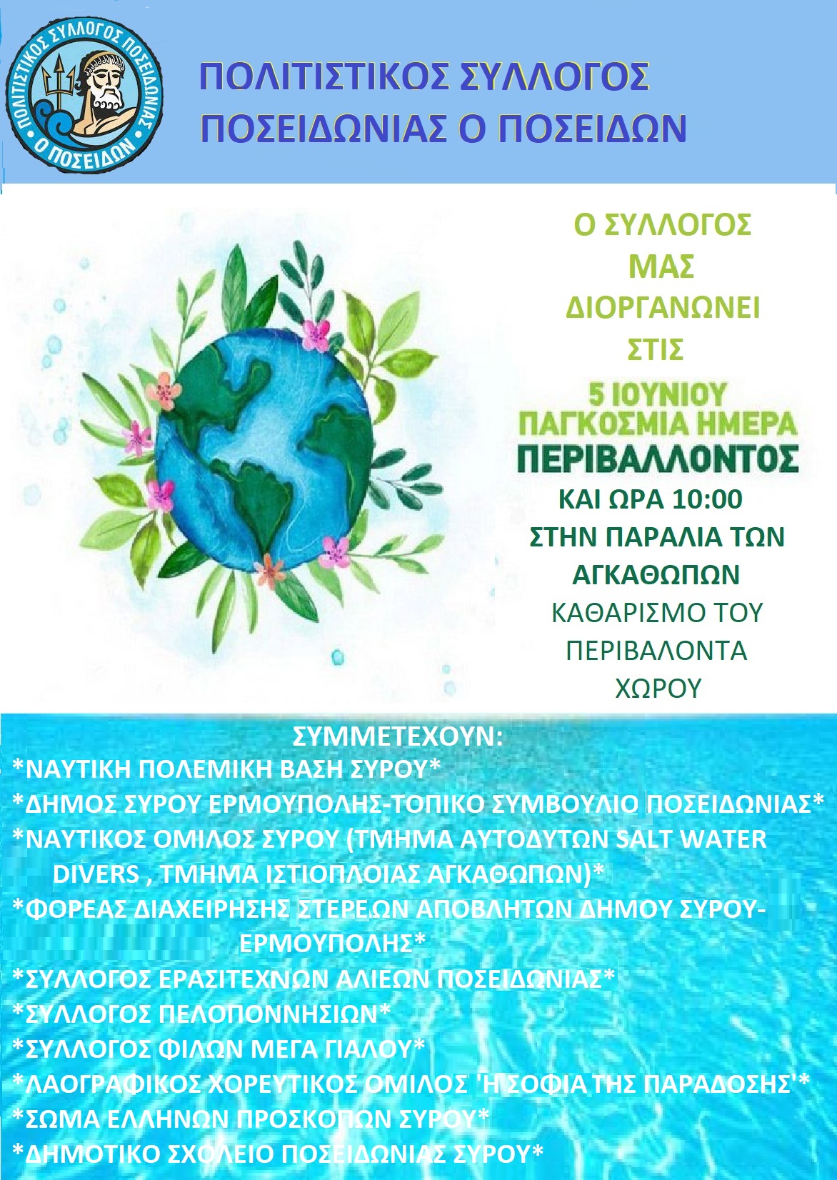 Ο Πολιτιστικός Σύλλογος Ποσειδωνίας «Ο Ποσειδών», διοργανώνει την Κυριακή 5-6-2022, Παγκόσμια Ημέρα Περιβάλλοντος, εκστρατεία καθαρισμού των ακτών, των παραλιών και του βυθού της Ποσειδωνίας, συμμετέχοντας με αυτό τον τρόπο στην σημαντική αυτή παγκόσμια εκδήλωση.