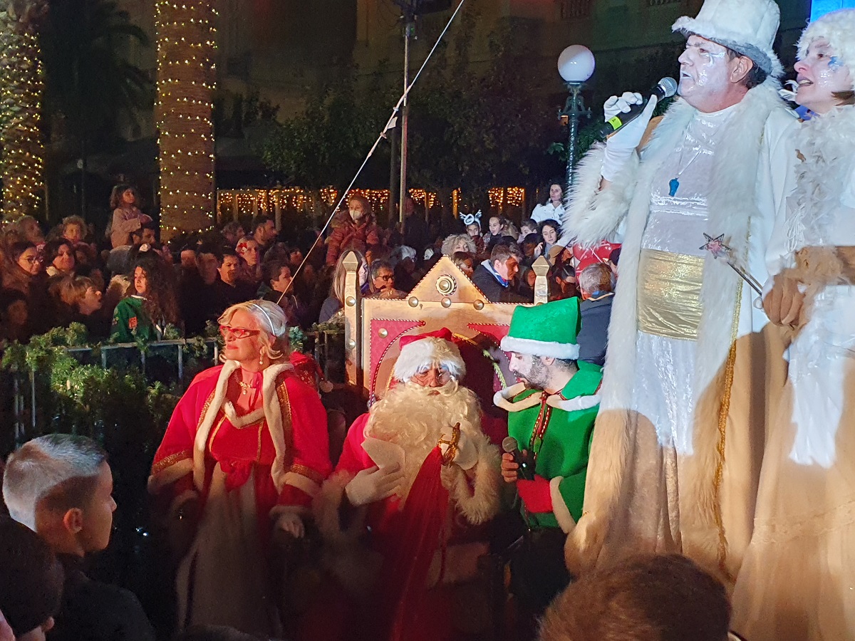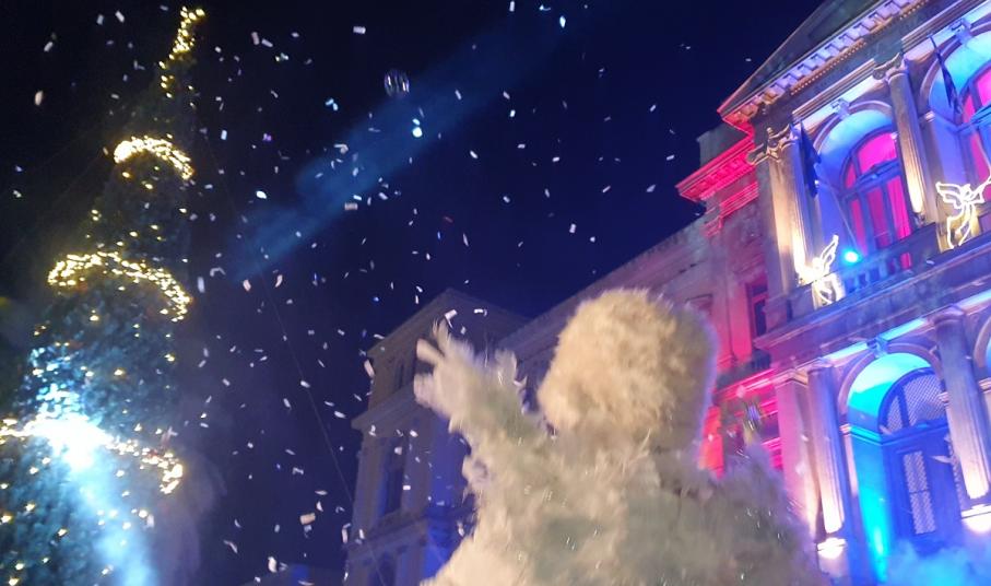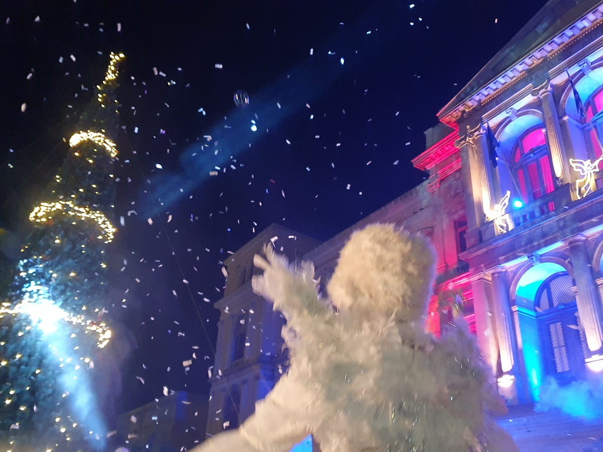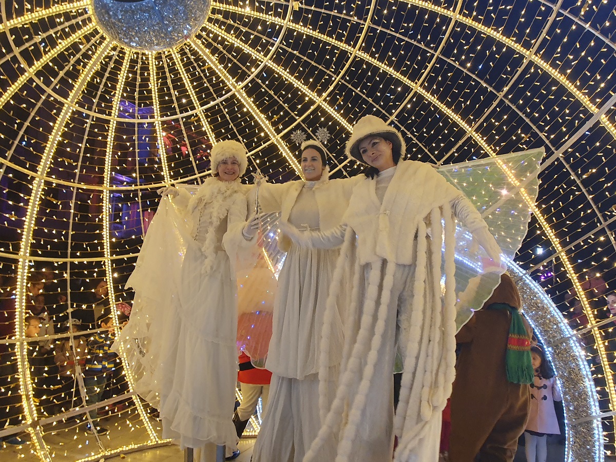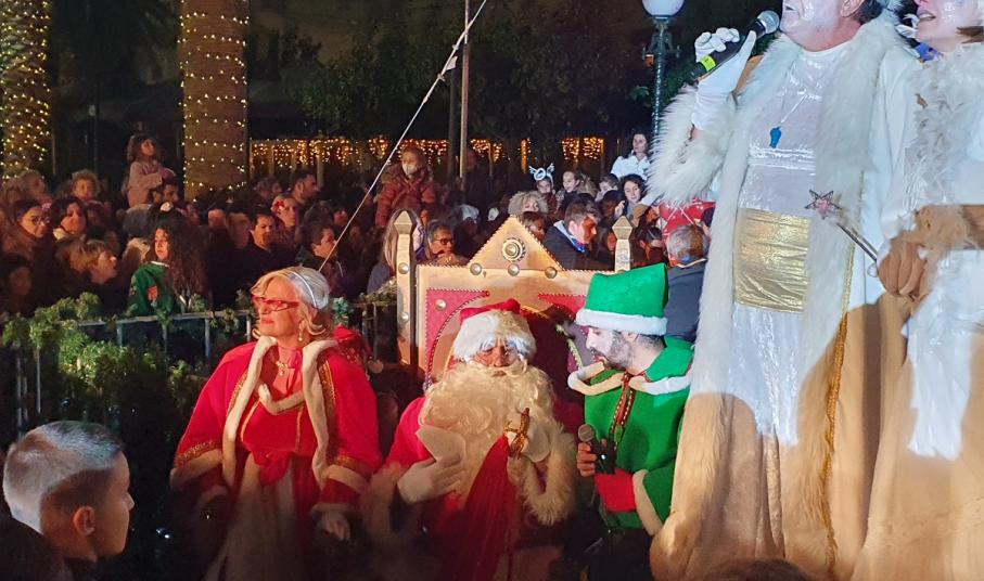 Οι εκδηλώσεις ξεκίνησαν στις 18:00, με το πλήθος να έχει μαζευτεί από πολύ νωρίς για να παρακολουθήσει την εξέλιξη της βραδιάς. Αριστερά και δεξιά από τα σκαλιά του Δημαρχείου βρίσκονται οι δύο μεγάλες φωτεινές χριστουγεννιάτικες μπάλες, που συγκέντρωσαν το φωτογραφικό ενδιαφέρον του κόσμου. Μέσα στο πλήθος της πλατείας κυκλοφορούσαν ξυλοπόδαροι, καθώς και ένας “τάρανδος”, ένας “χιονάνθρωπος” και ένας “στρατιώτης”, που όλοι τους δέχτηκαν με μεγάλη χαρά, με τα μικρά παιδιά να σπεύδουν να φωτογραφηθούν μαζί τους.