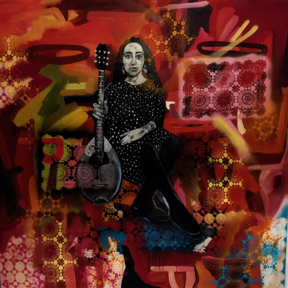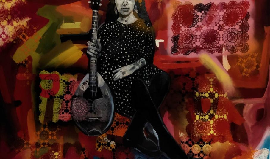 “Το 1922 οι Μικρασιάτες, μέσα από τις φλόγες έφεραν στην Ελλάδα το ρεμπέτικο. Η μουσική αυτή ήταν ο συγκερασμός από Βυζαντινούς, Ανατολίτικους και παραδοσιακούς ήχους. Οι πρόσφυγες έφεραν στη νέα τους πατρίδα, στις φτωχογειτονιές, γύρω από τα εργοστάσια, τραγούδια που μιλούσαν για τον πόνο, τον χαμένο έρωτα, τη νοσταλγία και την ξενιτιά. Τα λιμάνια του Πειραιά, της Θεσσαλονίκης και της Κωνσταντινούπολης γέμιζαν με ήχους σε ρυθμούς καρσιλαμά, τσιφτετελιού, χασάπικου, ζεϊμπέκικου”. Με αυτά τα λόγια περιγράφει το έργο της η Αγνή Ρούσσου, το οποίο εντάσσεται στο τρίτο μέρος της έκθεσης με τίτλο «Πρόσφυγες: 1922+ επιβίωση-ενσωμάτωση», ενώ αφηγείται στην “Κοινή Γνώμη” την πηγή έμπνευσής της: “ Πριν λίγα χρόνια είχα πάει μόνη μου ένα ταξίδι στη Σμύρνη. Μία από τις εικόνες που χαράχτηκαν στο μυαλό μου ήταν μία πολύ μεγάλη τοιχογραφία με δερβίσηδες, ντέφια και καρσιλαμάδες. Όταν καλέστηκα να ζωγραφίσω για την έκθεση, ήρθε αυτή η εικόνα στο μυαλό μου και θέλησα να ζωγραφίσω κάτι που να θυμίζει έναν τοίχο, μέσα στον οποίο απεικονίζομαι εγώ με το μπουζούκι μου. Είναι μία μεικτή τεχνική με ακρυλικά και στένσιλ με σπρέι, όπου το κόκκινο χρώμα που κυριαρχεί συμβολίζει τη φωτιά και την καταστροφή. Σχετικά με το μήνυμα ή το συναίσθημα που επιδιώκει να μεταδώσει μέσα από το έργο της, απαντά: “Ο καθένας, με τις δικές του προσλαμβάνουσες, αντιλαμβάνεται αυτό που θέλει. Δεν θέλω να κατευθύνω κάποιον να νιώσει κάτι”.