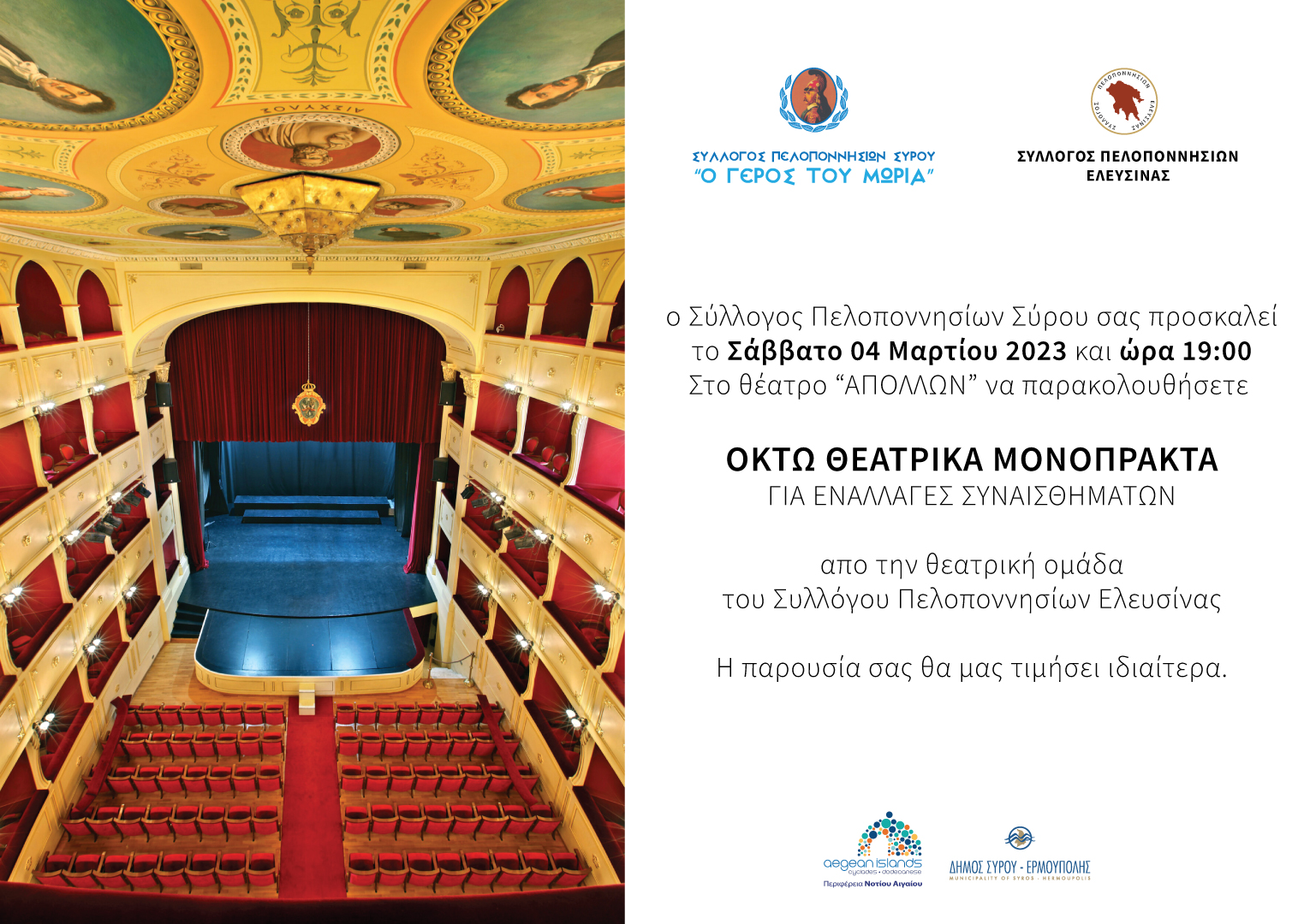Σύλλογος Πελοποννησίων Σύρου: Οκτώ θεατρικά μονόπρακτα