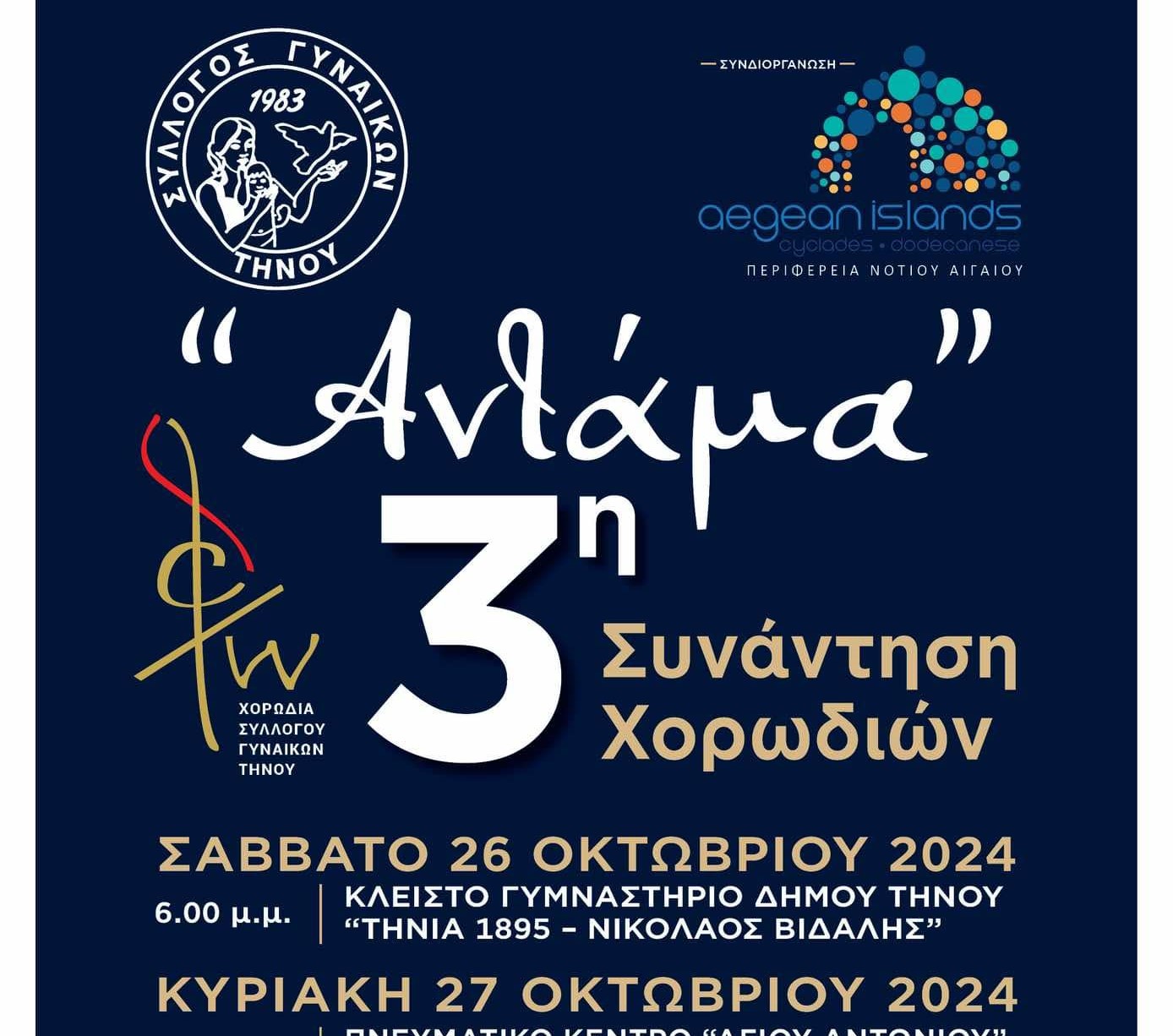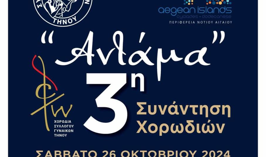 Ο Σύλλογος Γυναικών Τήνου, μαζί με την Περιφέρεια Νοτίου Αιγαίου, συνδιοργανώνουν την τρίτη συνάντηση χορωδιών "Αντάμα" στην Τήνο, το Σάββατο 26 Οκτωβρίου, στις 6 το απόγευμα, στο κλειστό γυμναστήριο Δήμου Τήνου "Τήνια 1895- Νικόλαος Βιδάλης".