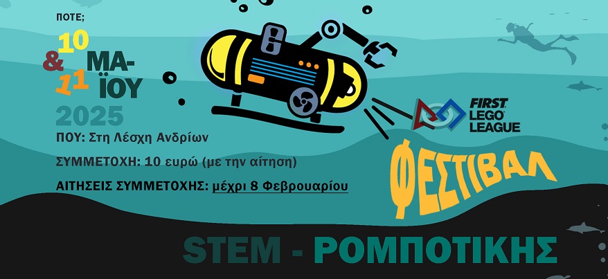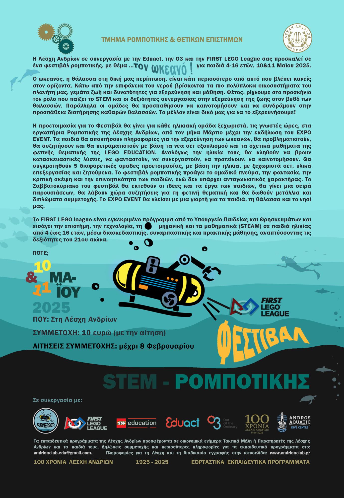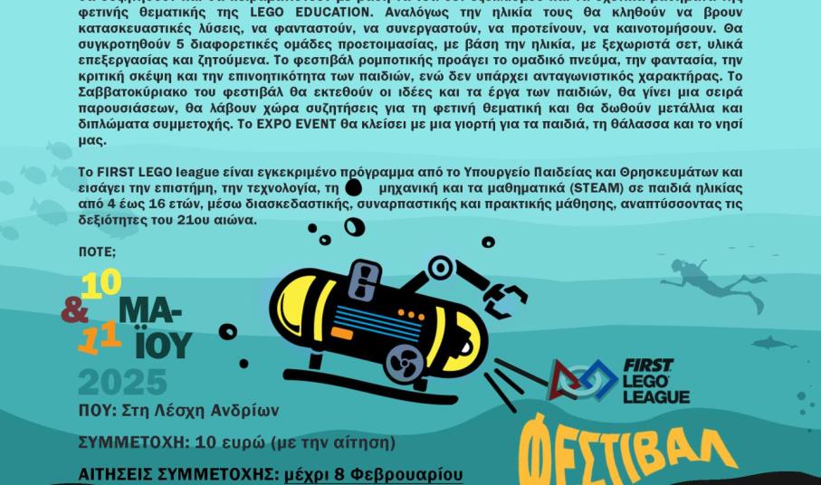 Η Λέσχη Ανδρίων σε συνεργασία με την Eduact, την O3 και την FIRST LEGO League σας προσκαλεί σε ένα φεστιβάλ ρομποτικής, με θέμα τον ωκεανό!