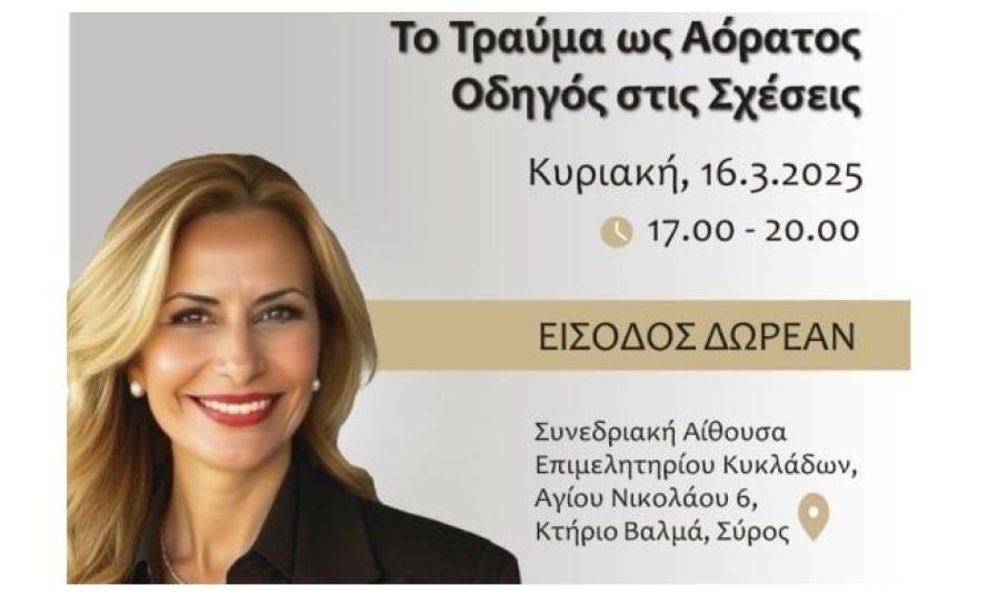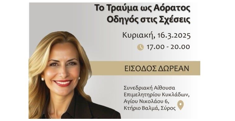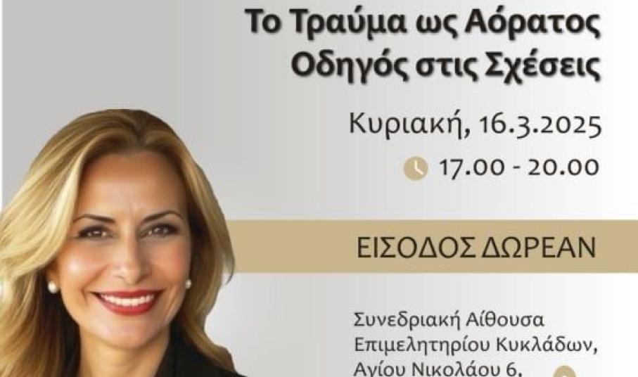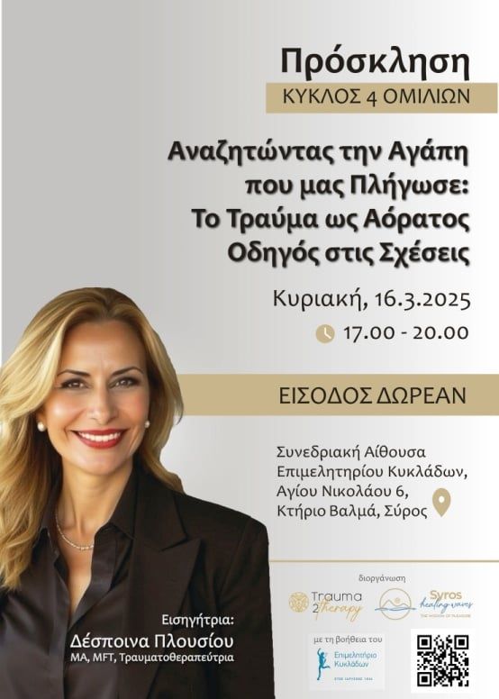 Μετά την εγκάρδια υποδοχή της 1ης ομιλίας "Από το τραύμα στην θεραπεία", στις 16 Φεβρουαρίου, η Δέσποινα Πλουσίου, τραυματοθεραπεύτρια και συνιδρύτρια του Trauma2Therapy Institute, συνεχίζει τον κύκλο διαλέξεων στη Σύρο με τη 2η ομιλία, με τίτλο "Αναζητώντας την αγάπη που μας πλήγωσε: Το τραύμα ως αόρατος οδηγός στις σχέσεις".