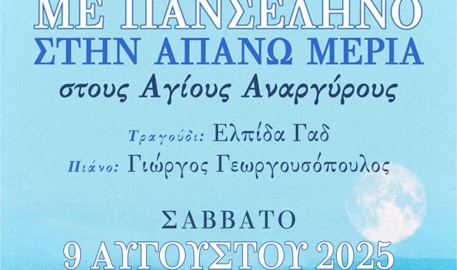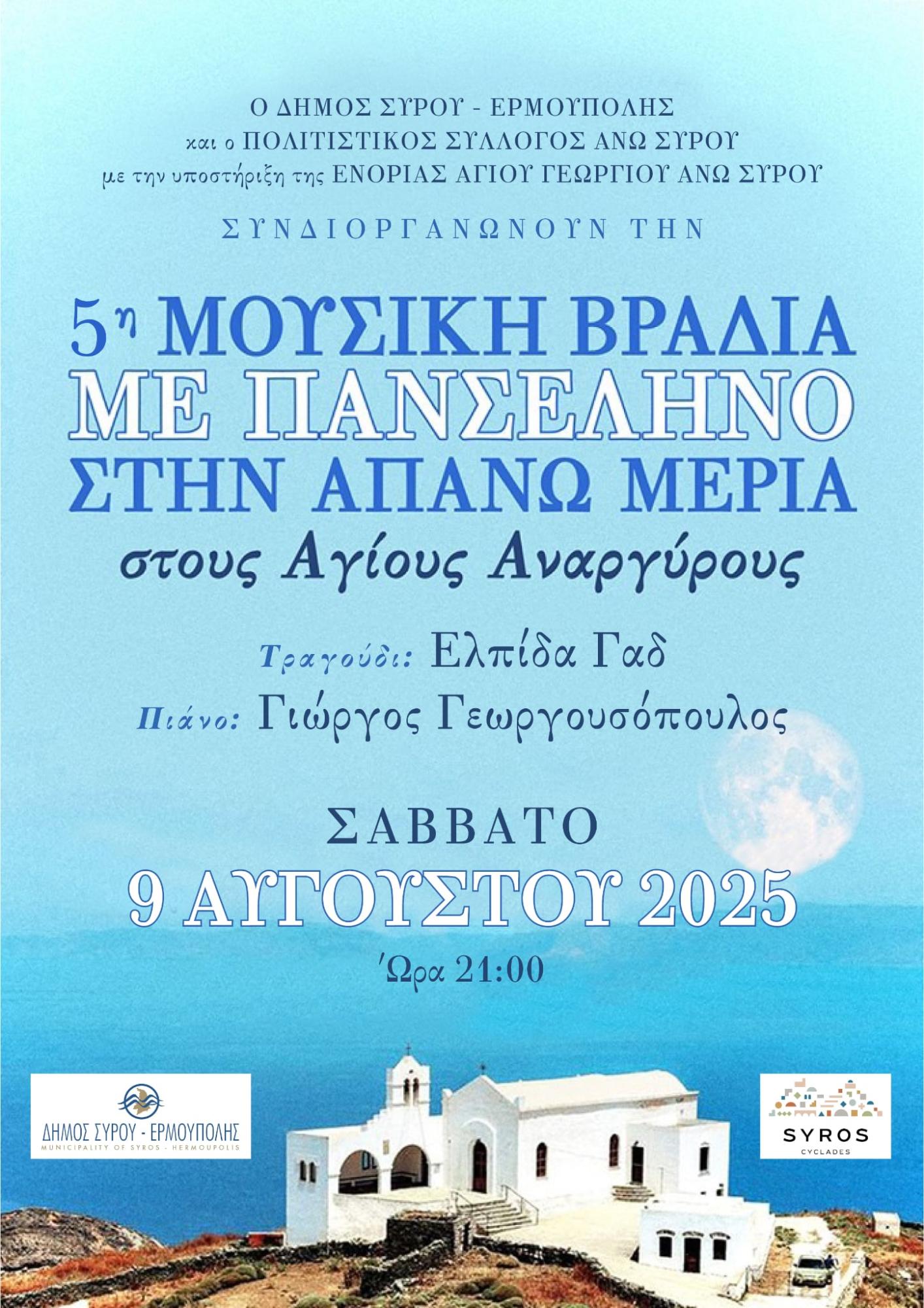 Ο Δήμος Σύρου Ερμούπολης και ο Πολιτιστικός Σύλλογος Άνω Σύρου σας προσκαλούν το Σάββατο 9 Αυγούστου 2025 στη μαγευτική Απάνω Μεριά της Άνω Σύρου να υποδεχθείτε μαζί για 5η χρονιά τη μπλε πανσέληνο του Αυγούστου, να προβάλλει από τη Δήλο και να ρίχνει τα "ασήμια" της στο Καστρί και στη Χαλανδριανή.