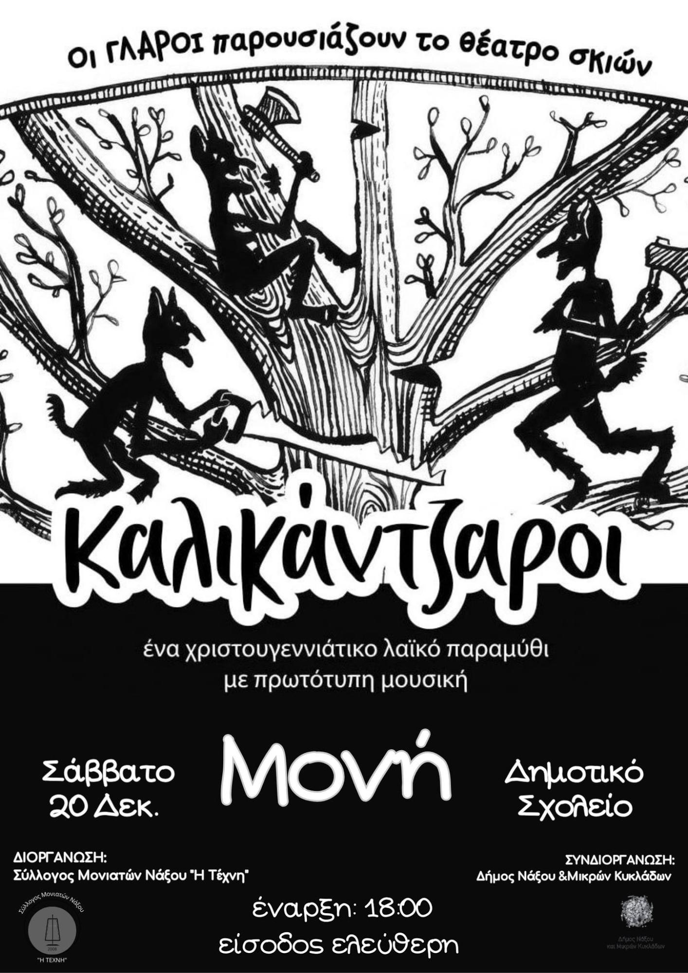 Οι “ΚαλιΚάντζαροι”, είναι χριστουγεννιάτικη παράσταση σε θέατρο σκιών εμπνευσμένη από την ελληνική παράδοση για μικρούς και μεγάλους. Το λαϊκό παραμύθι συναντά την παραδοσιακή τέχνη του θεάτρου σκιών για να ξεπηδήσουν από τα έγκατα της γης οι "ΚαλιΚάτζαροι". Ένα έργο βασισμένο στις ελληνικές παραδόσεις του 12ημέρου των Χριστουγέννων, με πρωτότυπη μουσική από μεταπτυχιακούς φοιτητές του μουσικού Πανεπιστημίου Ολλανδίας.