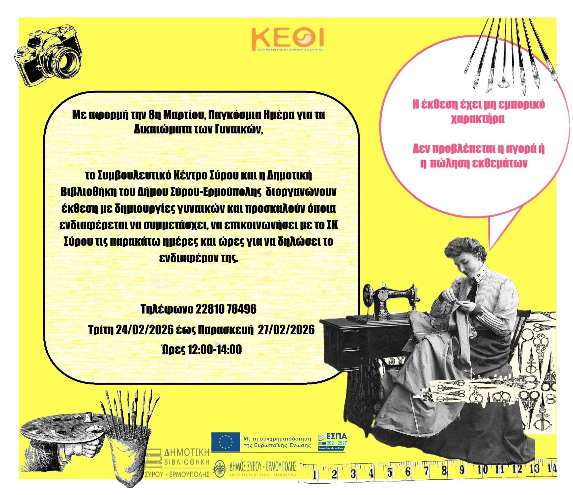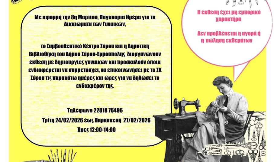 Με αφορμή την 8η Μαρτίου, Παγκόσμια Ημέρα για τα Δικαιώματα των Γυναικών, το Συμβουλευτικό Κέντρο Σύρου και η Δημοτική Βιβλιοθήκη του Δήμου Σύρου-Ερμούπολης διοργανώνουν έκθεση με δημιουργίες γυναικών.