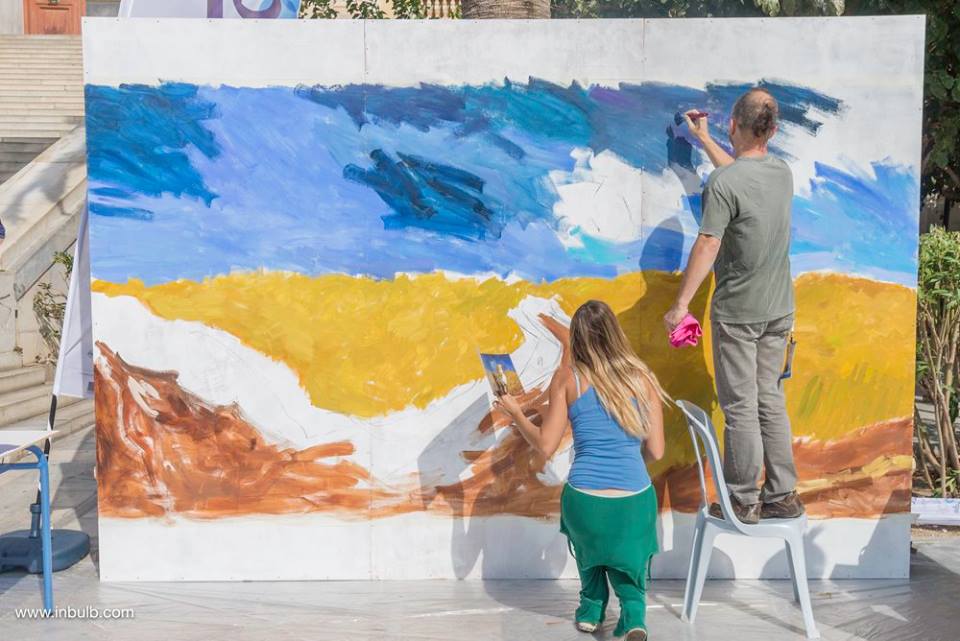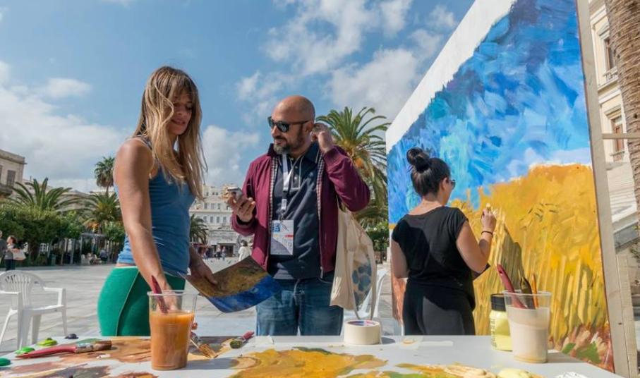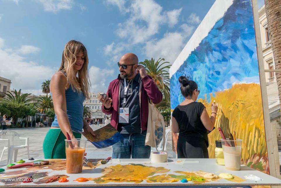 Και ενώ μια σειρά από προβολές, ενδιαφέρουσες ομιλίες και δημιουργικά εργαστήρια βρίσκονταν σε εξέλιξη, ένα μοναδικό εικαστικό δρώμενο στήθηκε στην Πλατεία Μιαούλη όπου ένας από τους γνωστότερους πίνακες του Βαν Γκογκ “ζωντάνεψε”. Τρεις Έλληνες συντελεστές της ταινίας “Loving Vincent” -η οποία προβλήθηκε στο Διαγωνιστικό τμήμα Ταινών Μεγάλου Μήκους | Κατηγορία Βραβείο Κοινού του Animasyros10- δημιούργησαν ζωντανά τον πίνακα «Σταροχώραφα με κοράκια» σε έναν μεγάλης κλίμακας καμβά που στήθηκε στην πλατεία, ενθουσιάζοντας τους περαστικούς.