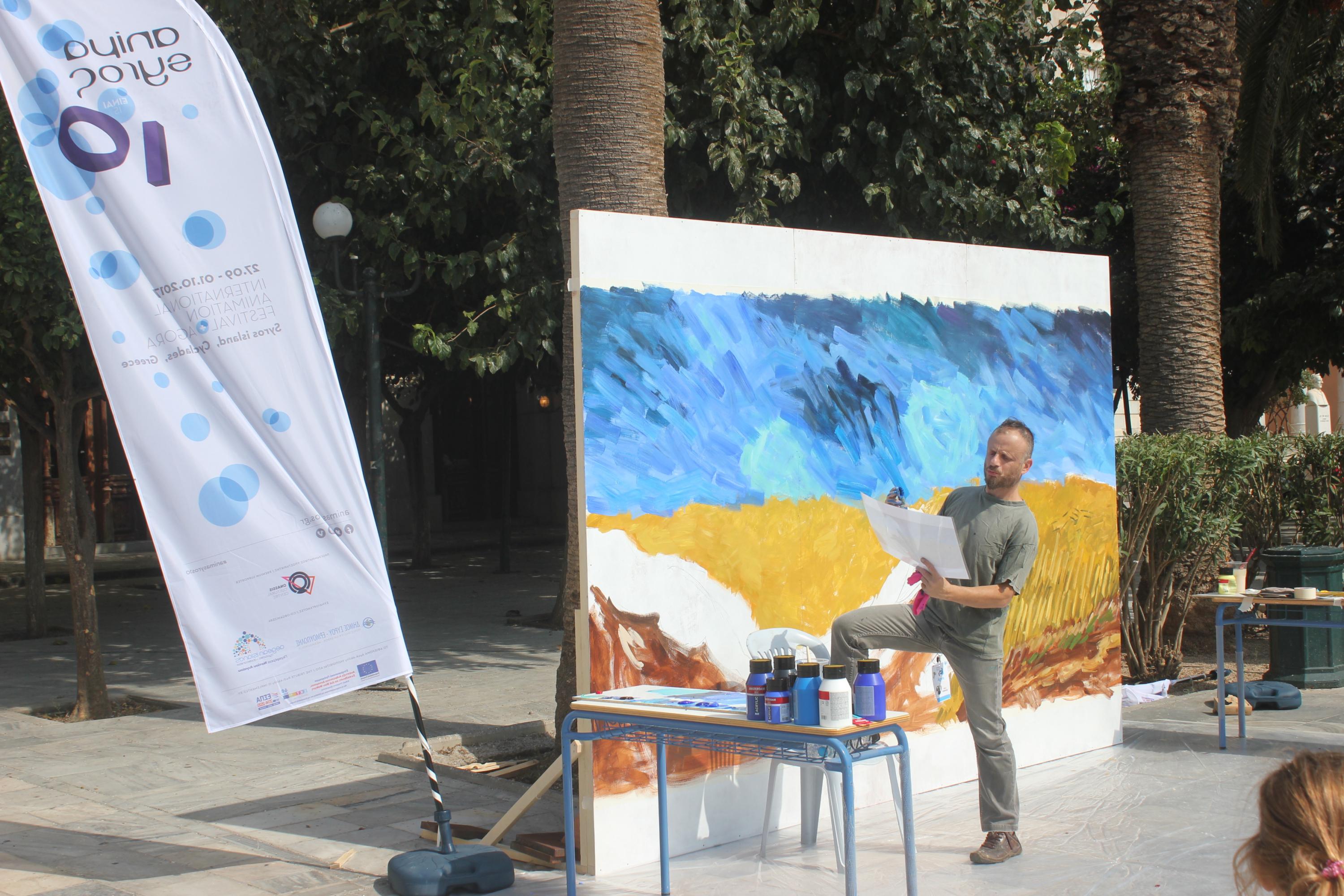 Στο πλαίσιο του Animasyros 10 πραγματοποιήθηκε σε συνεργασία με το Studio Bauhaus, την ελληνική εταιρεία παραγωγής που συντόνισε την εικαστική ομάδα της ταινίας στην Ελλάδα, δρώμενο που περιελάμβανε τη ζωντανή δημιουργία πίνακα του Van Gogh. Ειδικότερα, τρεις Έλληνες συντελεστές της ταινίας “Loving Vincent” -η οποία προβλήθηκε το ίδιο βράδυ στο Διαγωνιστικό τμήμα Ταινιών Μεγάλου Μήκους, στην Κατηγορία Βραβείο Κοινού του Animasyros 10 δημιούργησαν ζωντανά τον πίνακα «Σταροχώραφα με κοράκια» σε έναν μεγάλης κλίμακας καμβά που στήθηκε στην Πλατεία Μιαούλη, ενθουσιάζοντας κατοίκους και επισκέπτες του νησιού.