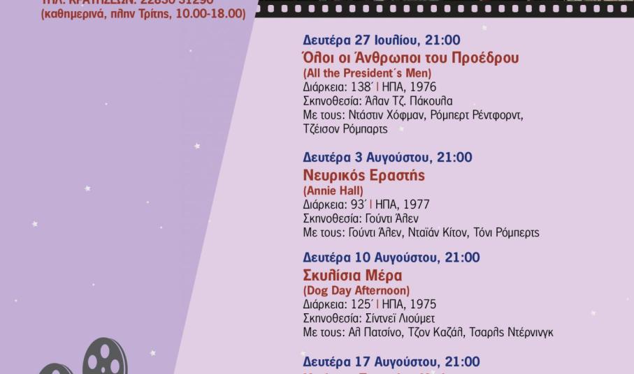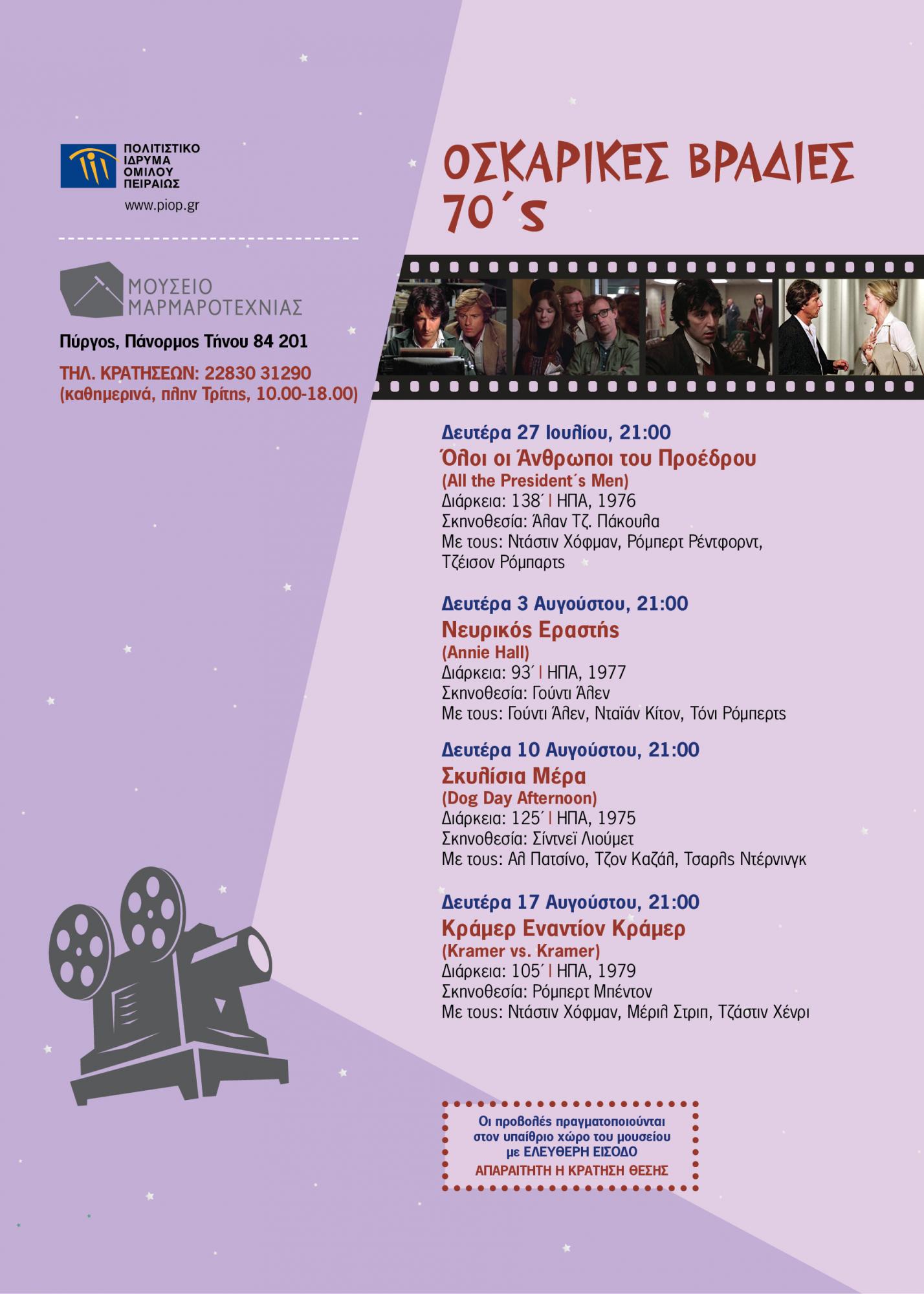 Το Πολιτιστικό Ίδρυμα Ομίλου Πειραιώς (ΠΙΟΠ) οργανώνει θερινό κινηματογραφικό αφιέρωμα με τίτλο «Οσκαρικές βραδιές 70΄s», κάθε Δευτέρα από τις 27 Ιουλίου έως τις 17 Αυγούστου, στο Μουσείο Μαρμαροτεχνίας, στον Πύργο Τήνου. Στο αφιέρωμα παρουσιάζονται τέσσερις εμβληματικές ταινίες από τη δεκαετία του '70  που θριάμβευσαν στα Βραβεία Όσκαρ.