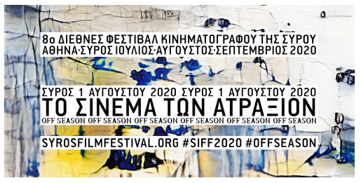 Αυτή η προβολή-εγκατάσταση θα αποτελέσει και τον προάγγελο του 8ου SIFF, που θα πραγματοποιηθεί από τις 3 έως και τις 6 Σεπτεμβρίου στη Σύρο. Ένα τετραήμερο προβολών και πρωτότυπων εκδηλώσεων, αποκλειστικά σε ανοιχτούς χώρους, από το οποίο σίγουρα δεν θα λείψει ούτε το drive-in που φέτος γιορτάζει έξι χρόνια!