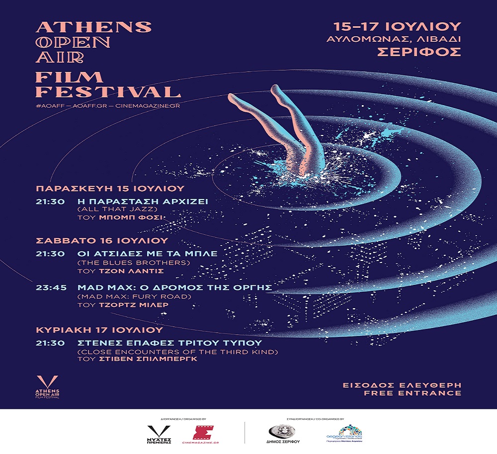 Φέτος, το Athens Open Air Film Festival, σε συνδιοργάνωση με την Περιφέρεια Νοτίου Αιγαίου, βάζει πλώρη για τη Σέριφο. Το μαγευτικό κινηματογραφικό ταξίδι απλώνεται σε τρεις μοναδικές βραδιές (15-17 Ιουλίου) δίπλα στη θάλασσα, οι οποίες πραγματοποιούνται σε συνεργασία με τον Δήμο Σερίφου, αρχής γενομένης (την Παρασκευή) με το αριστουργηματικό Η ΠΑΡΑΣΤΑΣΗ ΑΡΧΙΖΕΙ του Μπομπ Φόσι, μια από τις ωραιότερες δημιουργίες που μας χάρισε ποτέ το αμερικανικό σινεμά η οποία τιμήθηκε με Χρυσό Φοίνικα στο Φεστιβάλ Καννών. Το Σάββατο 16 Ιουλίου, στη διάρκεια μιας δυναμικής και απολύτως ψυχαγωγικής διπλής προβολής, οι απίθανοι ΑΤΣΙΔΕΣ ΜΕ ΤΑ ΜΠΛΕ του Τζον Λάντις πατούν τέρμα γκάζι για να συναντήσουν το MAD MAX: Ο ΔΡΟΜΟΣ ΤΗΣ ΟΡΓΗΣ του Τζορτζ Μίλερ, ενώ την Κυριακή 17 Ιουλίου, θα στρέψουμε όλοι μαζί το βλέμμα προς τον έναστρο, μυστηριώδη ουρανό του ΣΤΕΝΕΣ ΕΠΑΦΕΣ ΤΡΙΤΟΥ ΤΥΠΟΥ και θα γιορτάσουμε τα 45 χρόνια από την πρεμιέρα της μυσταγωγικής ταινίας του Στίβεν Σπίλμπεργκ με τον τρόπο που πρέπει.