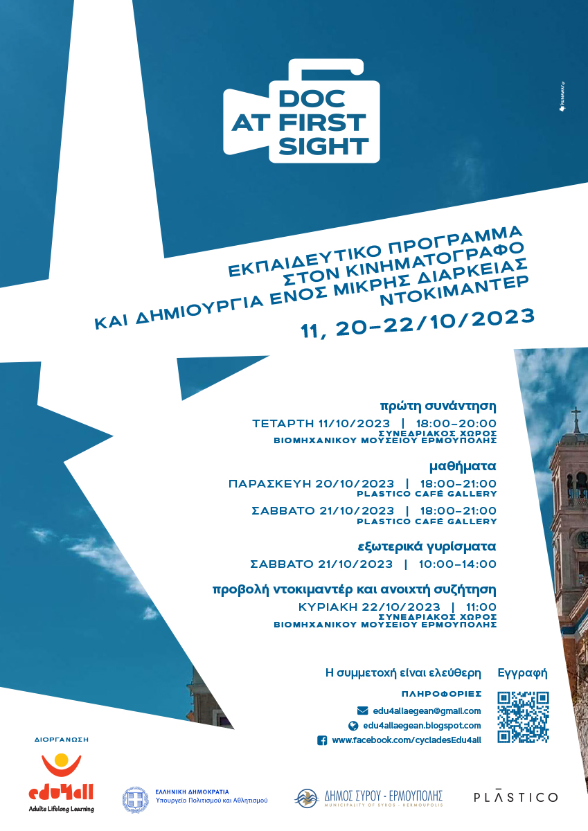 Η Αστική Μη Κερδοσκοπική Εταιρεία «Edu4all –Εκπαίδευση για όλους» διοργανώνει στην Ερμούπολη το "Doc at First Sight", ένα εκπαιδευτικό πρόγραμμα με θέμα τον κινηματογράφο και τη δημιουργία ντοκιμαντέρ.