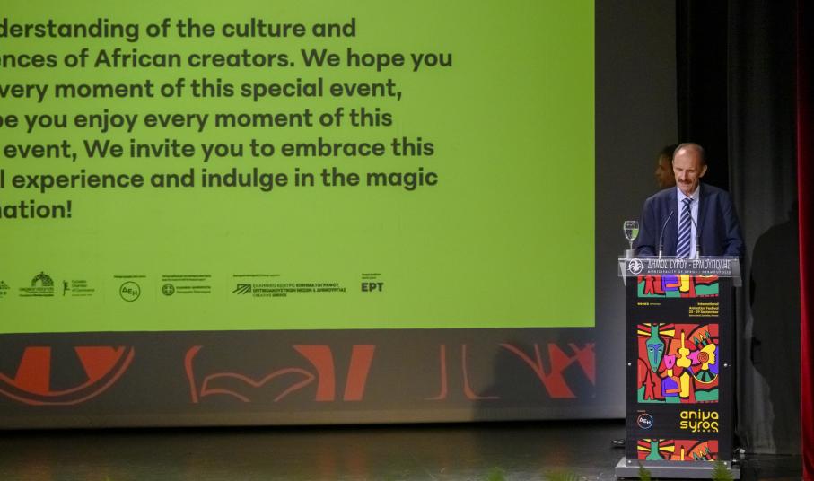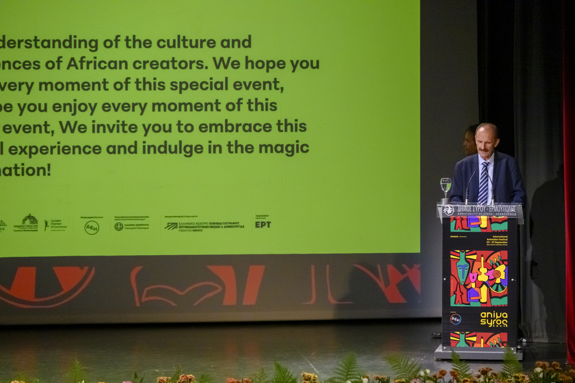 Την έναρξη της μεγάλης γιορτής του animation, η οποία αναμεταδόθηκε ζωντανά τόσο διαδικτυακά, όσο και στην πλατεία Μιαούλη, κήρυξε ο κεντρικός παρουσιαστής της εκδήλωσης, ιδρυτής και πρόεδρος του Αnimasyros, Βασίλης Καραμητσάνης, ο οποίος καλωσορίζοντας το κοινό αναφέρθηκε στη φετινή κεντρική θεματική του Φεστιβάλ που είναι η "Αφρική: Μία Ήπειρος Κινουμένων Σχεδίων".