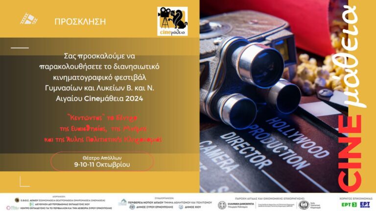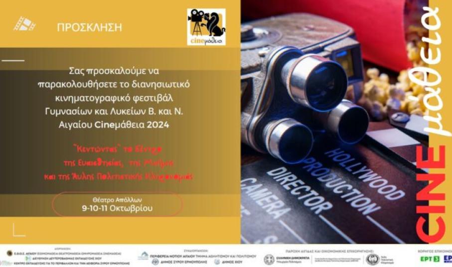 Το ΚΕΠΕΑ Σύρου Ερμούπολης συνδιοργανώνει για πρώτη φορά, μαζί με το "Έθος Αιγαίου" και την υπεύθυνη των Σχολικών Δραστηριοτήτων Δ. Δ. Ε Χίου, Δέσποινα Μουτάφη, το διανησιωτικό κινηματογραφικό Φεστιβάλ "CINEμάθεια, 2023-2024" που θα φιλοξενηθεί στην Ερμούπολη.