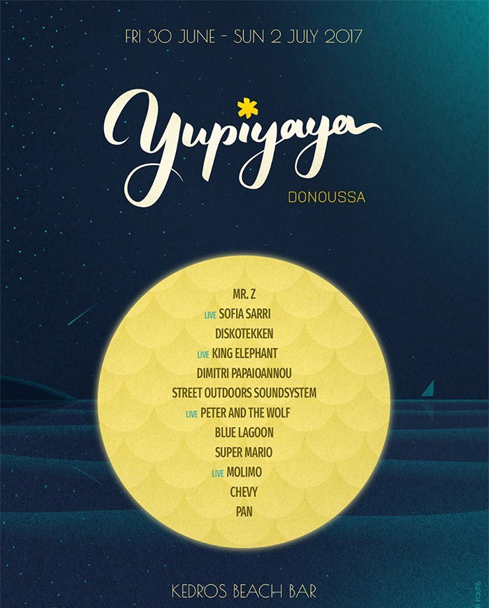 Το Yupiyaya είναι μία τριήμερη μουσική γιορτή, που θα πραγματοποιηθεί στη Δονούσα από την Παρασκευή, 30 Ιουνίου έως και την Κυριακή 2 Ιουλίου, στην παραλία του Κέδρου και όπως επισημαίνουν οι διοργανωτές της, “φιλοδοξεί να γίνει σημείο αναφοράς για την καλοκαιρινή περίοδο. Μερικοί από τους καλύτερους στο είδος τους Έλληνες DJs θα «ντύσουν» ηχητικά το μαγευτικό σκηνικό, πλαισιωμένοι από αξιόλογες ζωντανές εμφανίσεις. Σ’ ένα απ’ τα ομορφότερα μικρά νησιά του αρχιπελάγους, το Yupiyaya υπόσχεται μια υπέροχη μελωδική εμπειρία και τον καμβά για ένα ονειρικό καλοκαιρινό τριήμερο”.