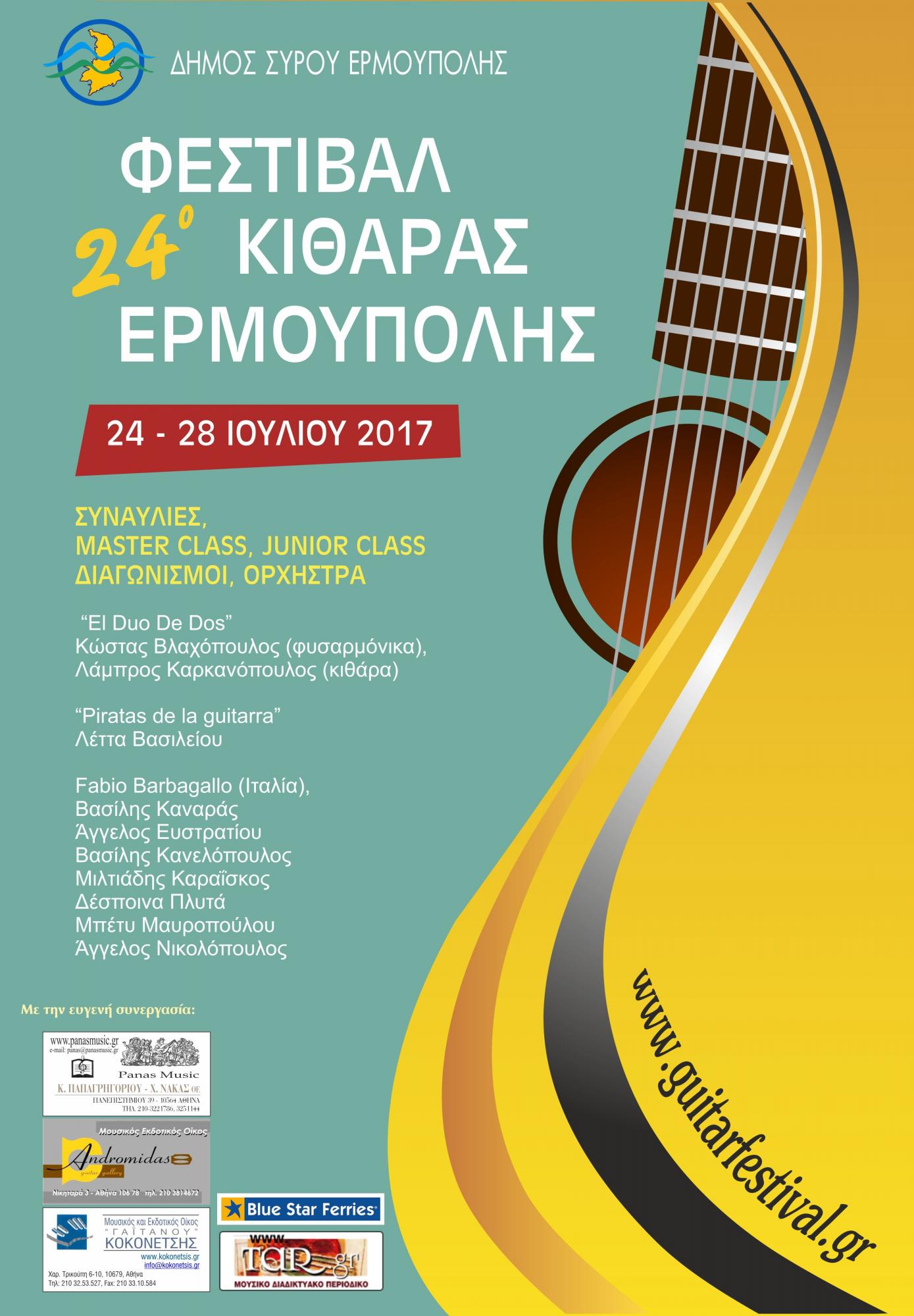 Στο πλαίσιο του πολιτιστικού προγράμματος του Δήμου Σύρου – Ερμούπολης «Σύρος –Πολιτισμός 2017», θα πραγματοποιηθεί το 24ο Φεστιβάλ Κιθάρας Ερμούπολης από τις 24 έως τις 28 Ιουλίου 2017.