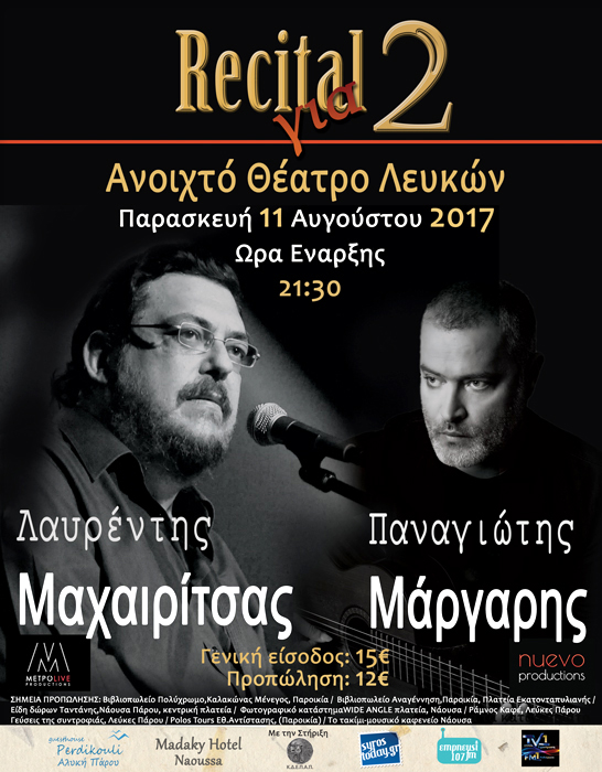 Μια πολύ ενδιαφέρουσα μουσική συνύπαρξη, ένα ανατρεπτικό ρεσιτάλ για δύο, όπου ο σπουδαιότερος τραγουδοποιός και ερμηνευτής της γενιάς του Λαυρέντης Μαχαιρίτσας, θα συναντήσει επί σκηνής τον διεθνούς φήμης βιρτουόζο της κιθάρας Παναγιώτη Μάργαρη.
